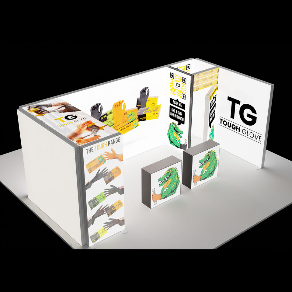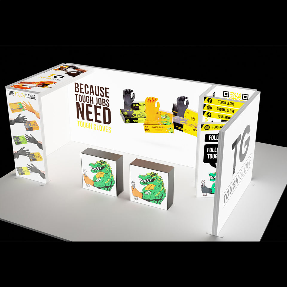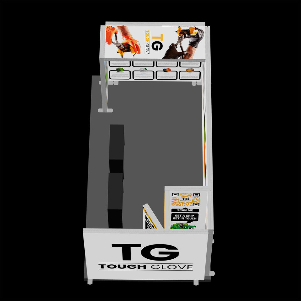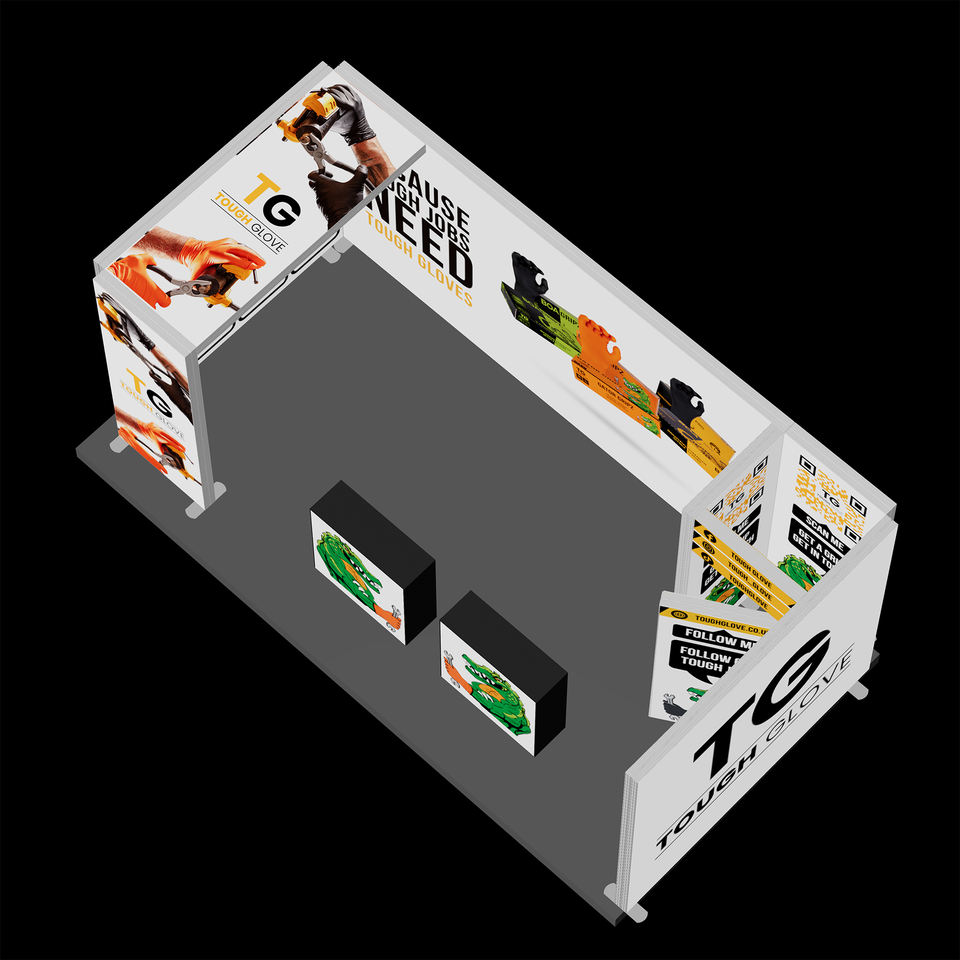 บูธแสดงสินค้ารูปตัวยูแบบกำหนดเองพร้อมกล่องไฟ SEG จอแสดงผลแบบพกพาสำหรับงานแสดงสินค้าพร้อมไฟเพดานด้านบนและกราฟิกทรงลูกบาศก์