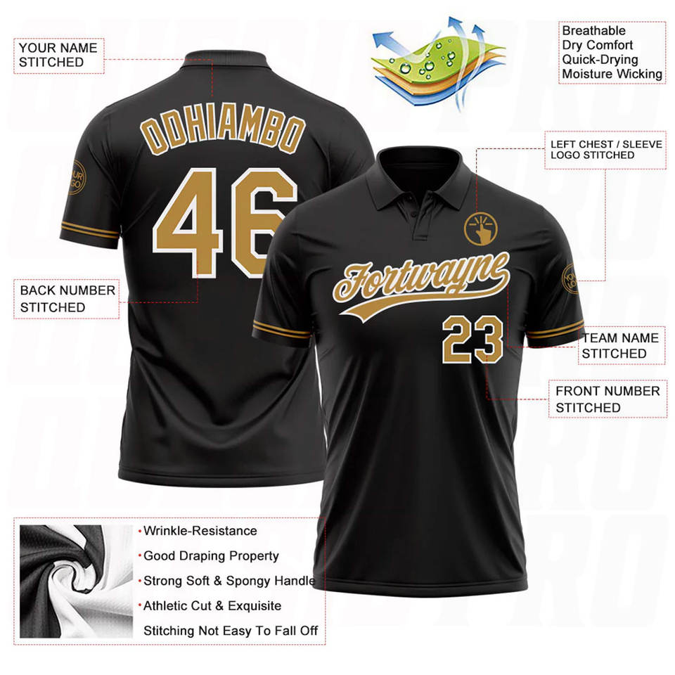 เสื้อโปโลซับลิเมชั่น UPF 50+ แห้งเร็ว สำหรับกอล์ฟ เทนนิส พิคเคิลบอล พร้อมโลโก้ สีดำ-ทองโบราณ
