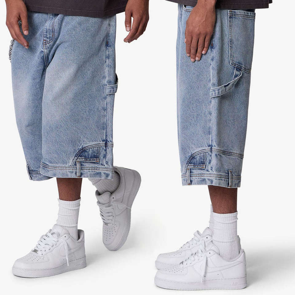 กางเกงขาสั้นผ้ายีนส์ขนาดใหญ่พิเศษสำหรับผู้ชายกางเกงขากว้างเอวกลางมีกระเป๋าทำงานมีโซ่ทอกระดุมฤดูร้อน