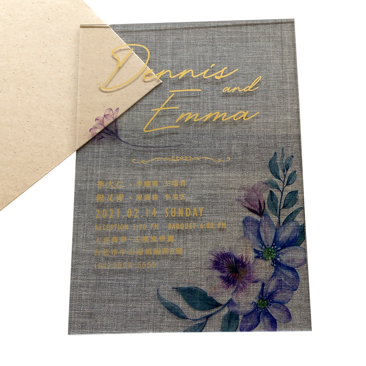 การ์ดเชิญงานหมั้นงานแต่งงานแบบใสสีทอง รุ่น 8 หนา 2 มม. น้ำหนัก 50 กรัม พิมพ์ออฟเซ็ต CMYK บนอะคริลิก ดีไซน์หรูหราไม่ซ้ำใคร