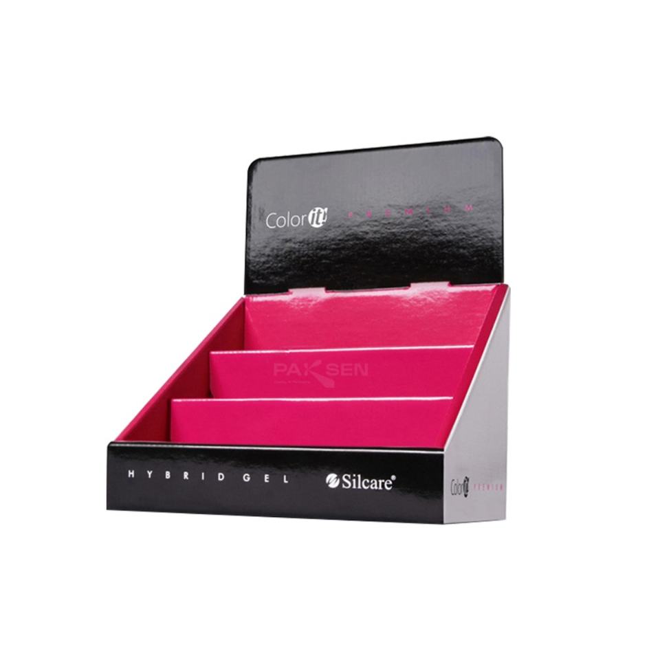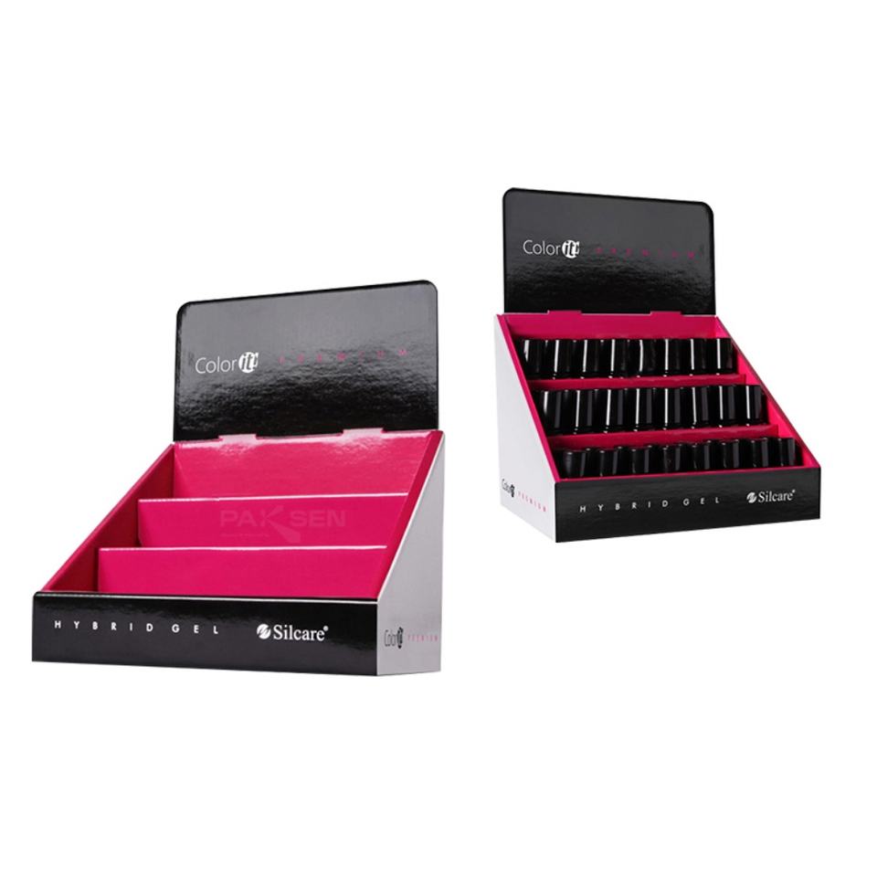 กล่องแสดงสินค้าแบบตั้งโต๊ะ/วางบนเคาน์เตอร์สำหรับอุปกรณ์เสริมโทรศัพท์มือถือแบบพกพา ของตกแต่งเฉพาะบุคคล การ์ดอวยพร และเครื่องสำอาง ทำจากกระดาษแข็ง พร้อมตะขอแขวน