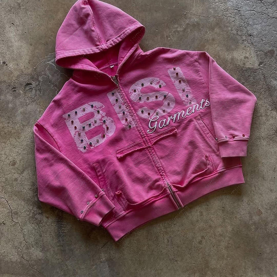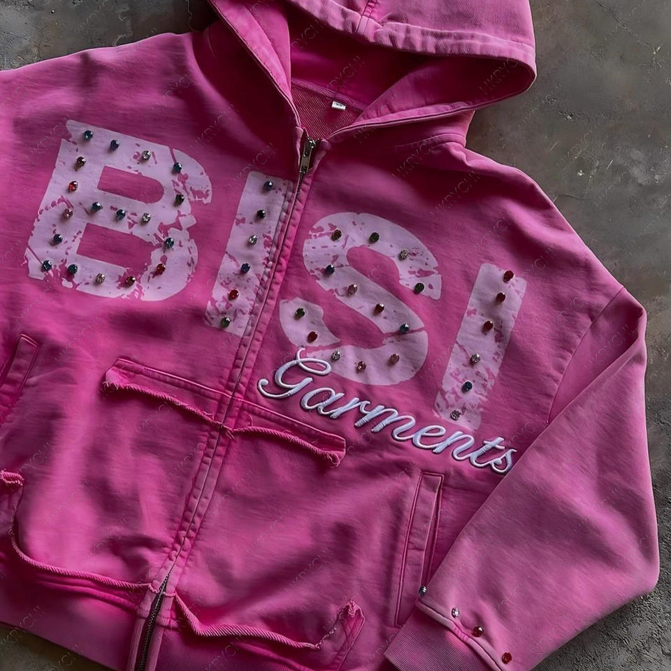 เสื้อมีฮู้ดทรงพอดีตัวปกติสำหรับทุกเพศผ้าฝ้าย100% เทอร์รี่สไตล์วินเทจปักลายประดับคริสตัลพลอยเทียม YK2ซิปพิมพ์360กรัมตามสั่ง