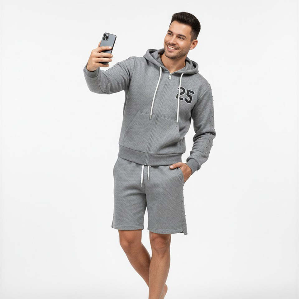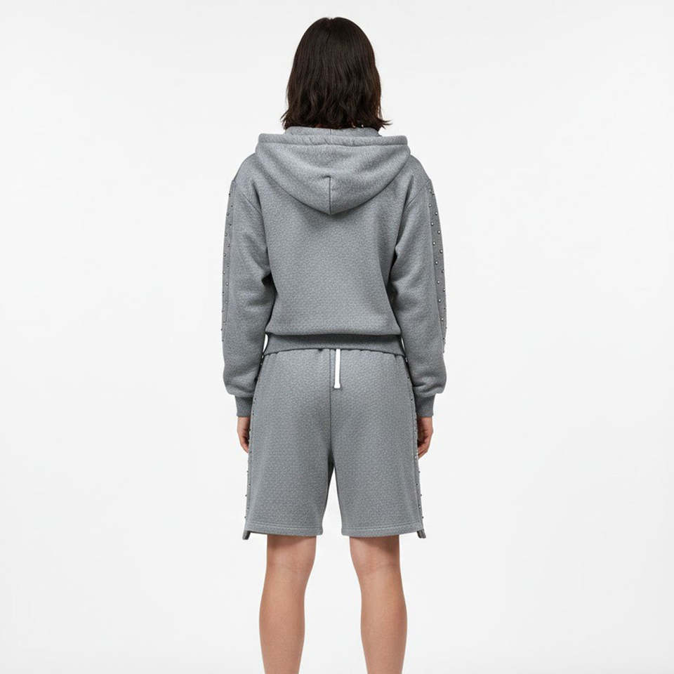 ชุดเซ็ตเสื้อฮู้ดซิปแขนประดับหมุดและกางเกงขาสั้นผ้าเฟรนช์เทอร์รี่สีเทาเฮเธอร์แบบยูนิเซ็กซ์ ชุดลำลองสำหรับออกกำลังกาย 2 ชิ้น