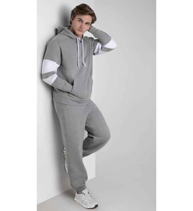 เสื้อฮู้ดสวมหัวใช้ได้ทุกเพศเสื้อฮู้ดผ้าฝ้ายสีขาวลายทางแขนสีเทาสองชั้นกำหนดโลโก้ได้เองสำหรับผู้ชายผู้หญิง