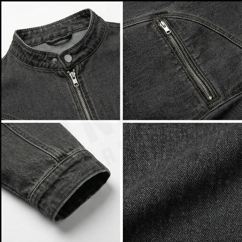 แจ็กเก็ตผ้ายีนส์วินเทจใส่ได้ทั้งชายและหญิงคอตั้งผ้าใบเสื้อคลุมกันหนาวมีซิปปิดสไตล์ฮิปฮอปซักได้ตามต้องการ