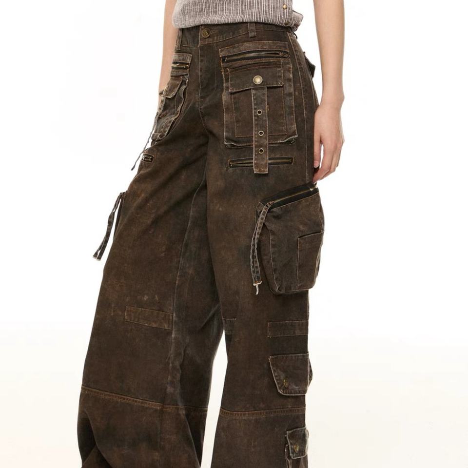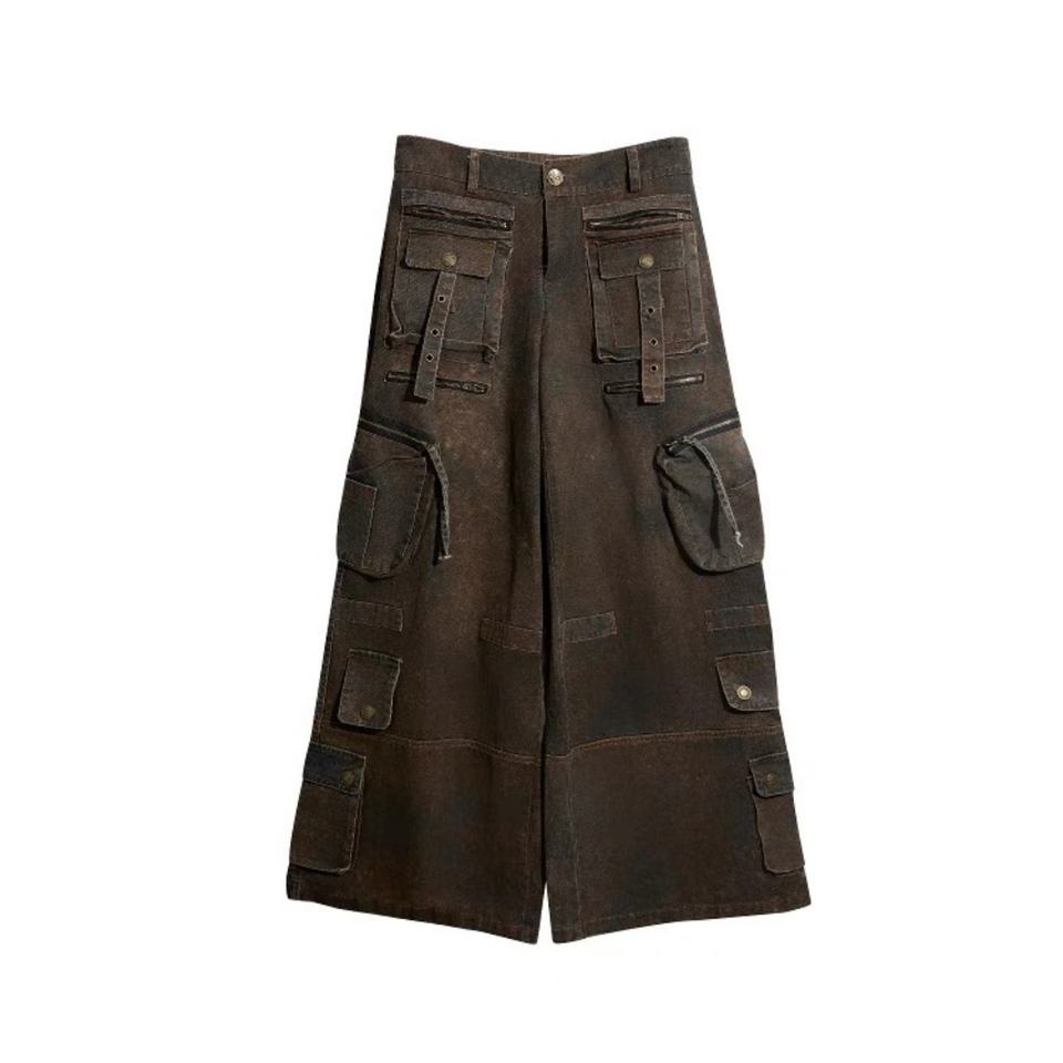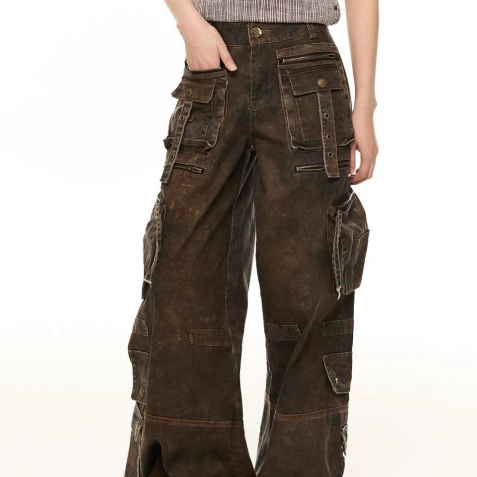 Custom Unisex Y2K Vintages Distressed Washed Multi-Pocket Wide-leg Cargo Jeans Unisex for Cyberpunk Street Fashion
