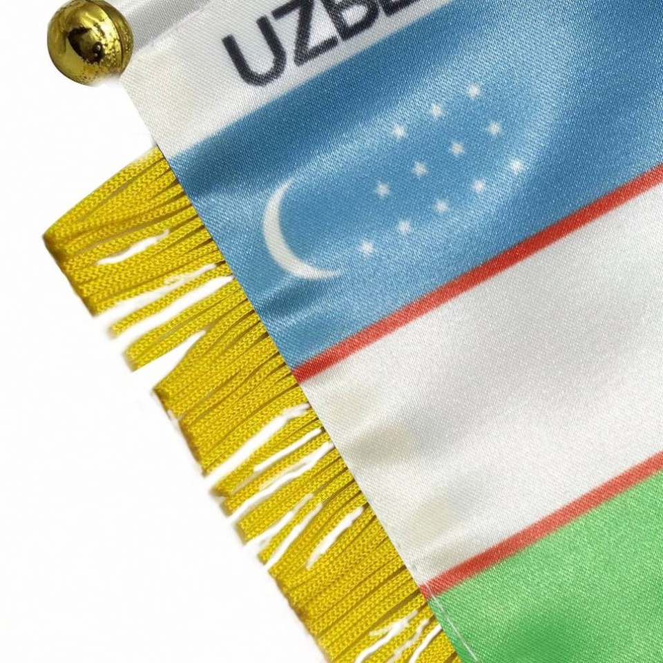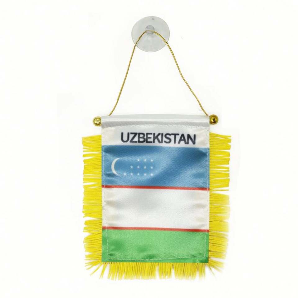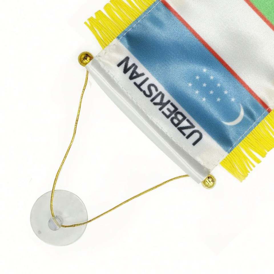 ธงซาตินอุซเบกิสถานแบบกำหนดเอง พิมพ์ลายดิจิทัล ธงติดรถยนต์ขนาดเล็ก พู่สีเหลือง ทำจากโพลีเอสเตอร์ทนทาน สำหรับตัวแทนการท่องเที่ยว