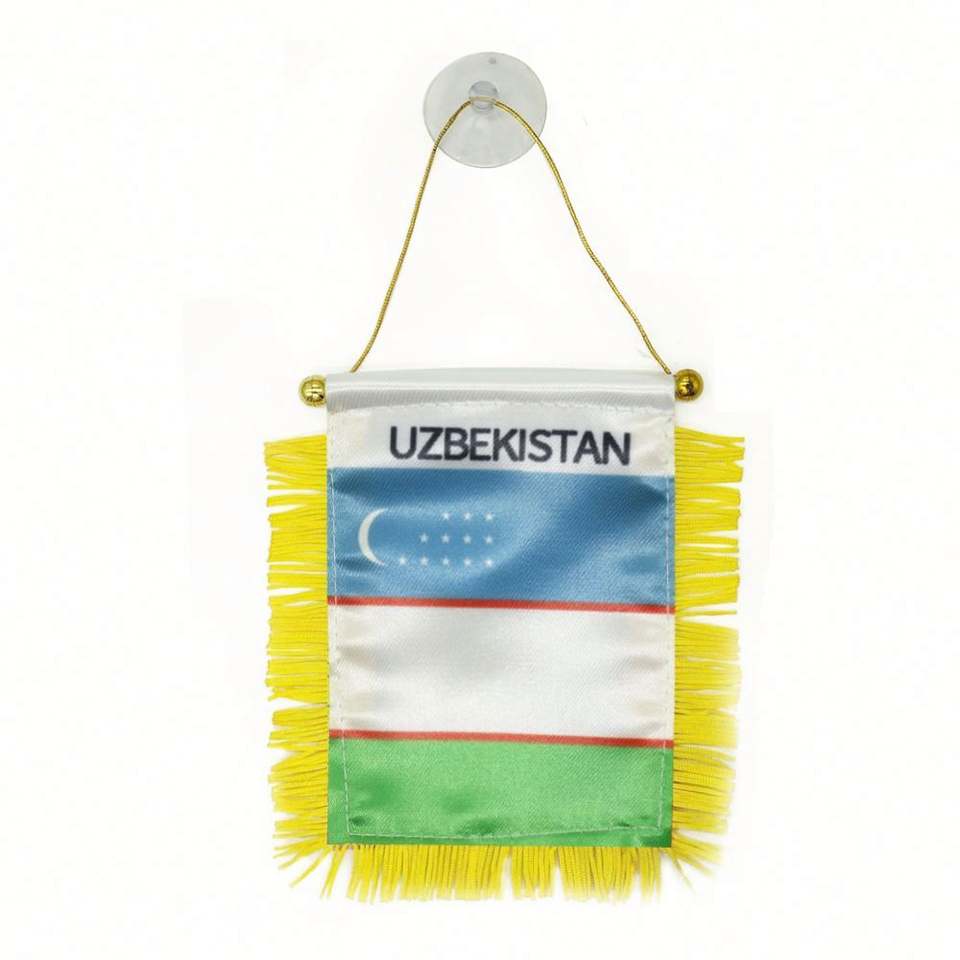 ธงซาตินอุซเบกิสถานแบบกำหนดเอง พิมพ์ลายดิจิทัล ธงติดรถยนต์ขนาดเล็ก พู่สีเหลือง ทำจากโพลีเอสเตอร์ทนทาน สำหรับตัวแทนการท่องเที่ยว