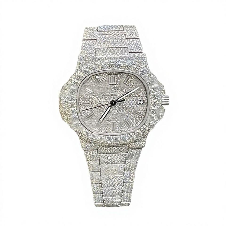 นาฬิกาข้อมือผู้ชายหรูหราประดับเพชรโมอิสซาไนต์ทรงกลมแบบกำหนดเอง VVS1 กันน้ำได้ 10 บาร์ ตัวเรือนสแตนเลสสตีล