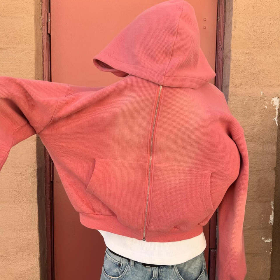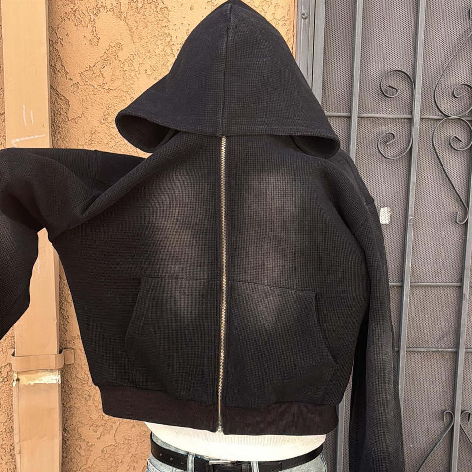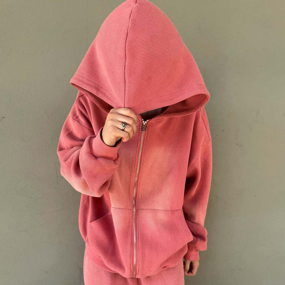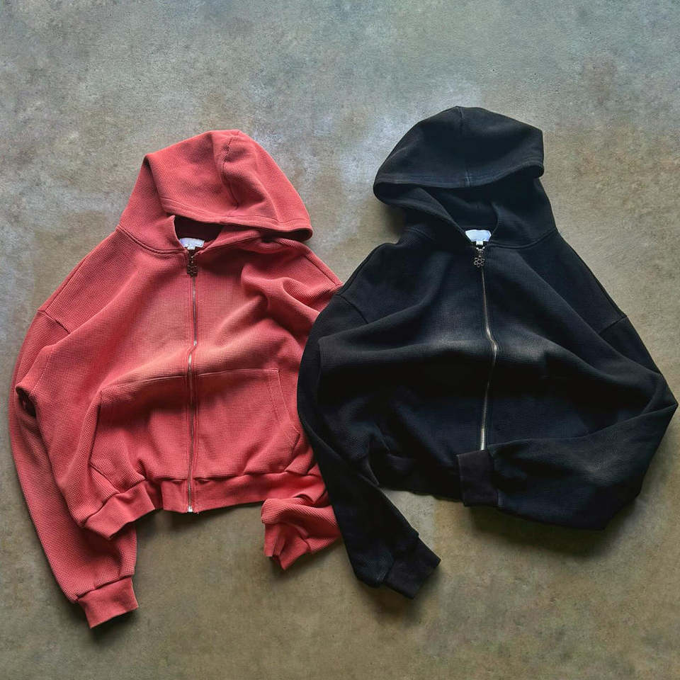 เสื้อฮู้ดดี้ผู้ชายแบบซิป วัสดุผ้าฝ้ายวินเทจแท้ 100% หนัก 500 กรัม ลายวาฟเฟิล ล้างสีแบบแอซิดวอช ทำสีซีดแบบซันเฟด สไตล์สตรีทแวร์ แต่งขอบด้วยผ้าดิสเทรส ซับในเพื่อความอบอุ่นในฤดูหนาว