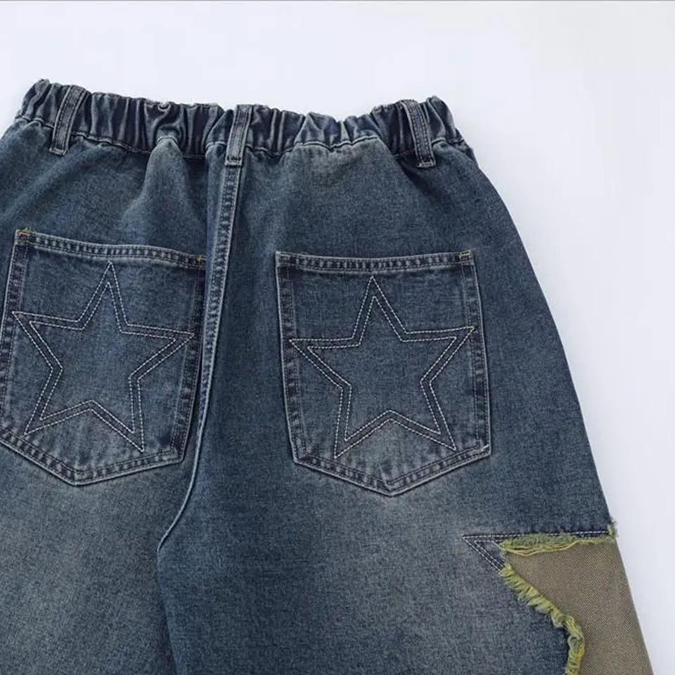 กางเกงขาสั้นผ้ายีนส์วินเทจสำหรับผู้ชายกางเกงยีนส์ขาสั้นระบายได้ดีปักลายดาวสำหรับผู้ชายผ้าซักเบา