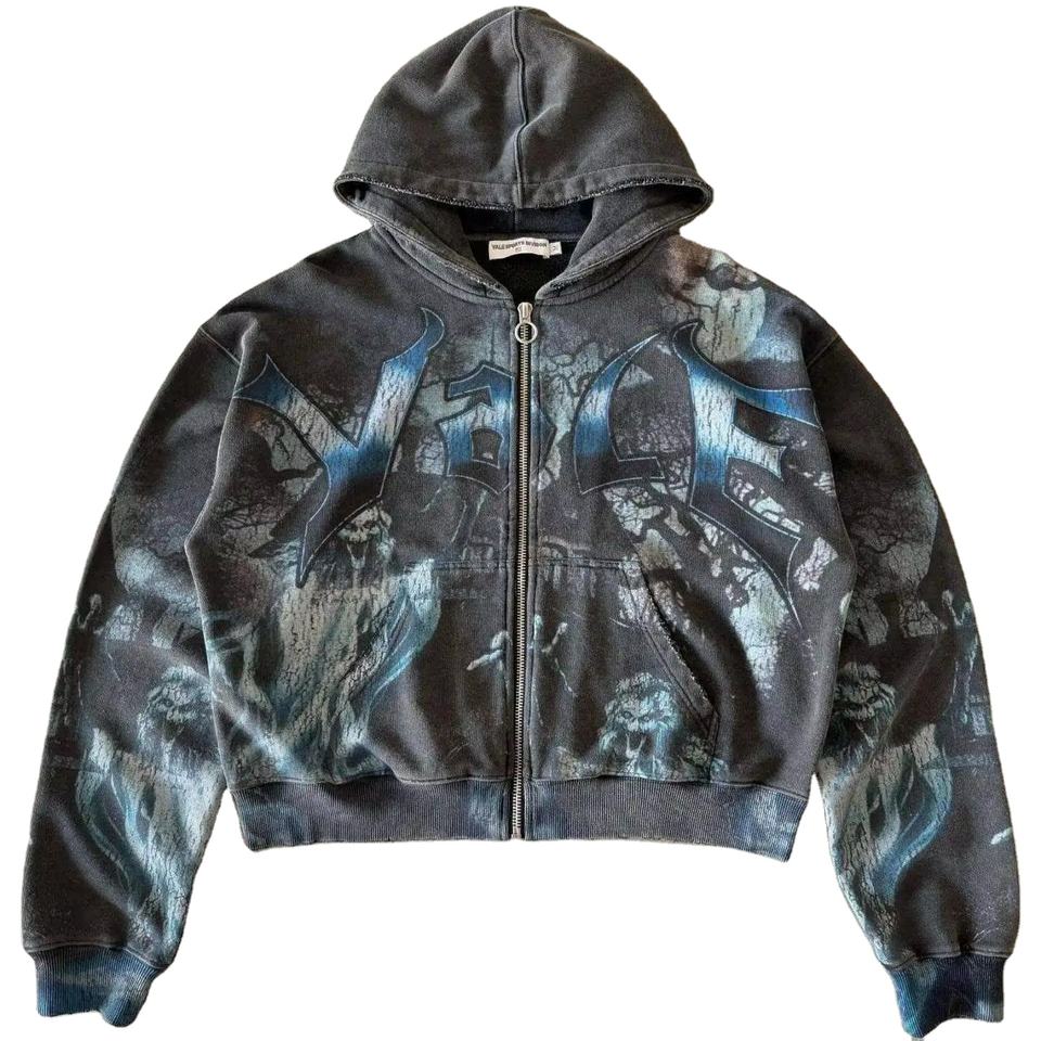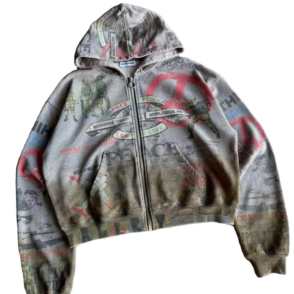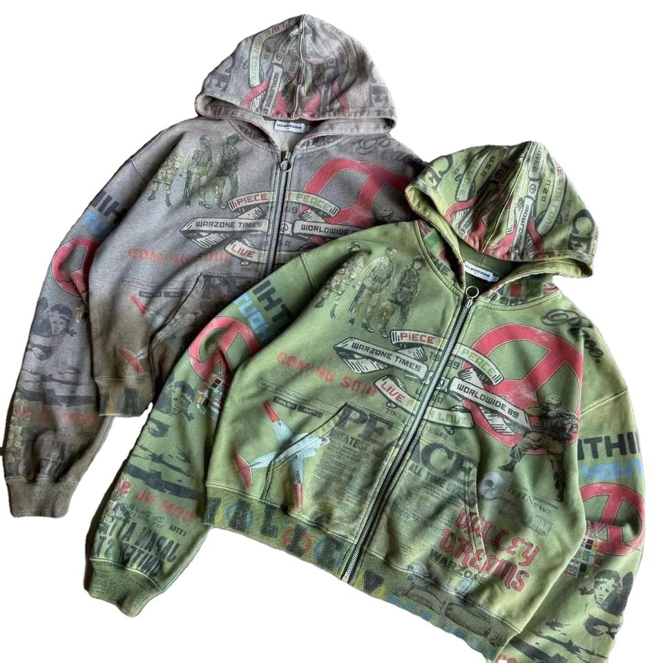 เสื้อแจ็คเก็ตซิปสไตล์วินเทจลายดอกไม้สตรีทแวร์เนื้อผ้าหนา พิมพ์ลายดิจิตอล ซิปแบบฝรั่งเศส ผ้าเฟรนช์เทอร์รี่ ลายการ์ตูน ล้างสีแบบแอซิดวอช แบบดิสเทรส