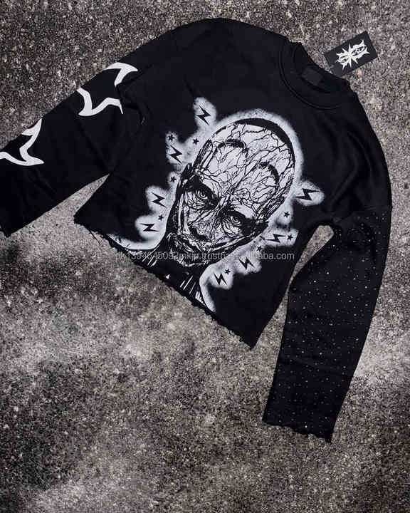 เสื้อยืดวินเทจผู้ชายแบบสั่งทำพิเศษ พิมพ์ลายเต็มตัว คอกลม แขนยาว ทรงบ็อกซี่ ประดับคริสตัล สไตล์โอเวอร์โหลด หรูหรา