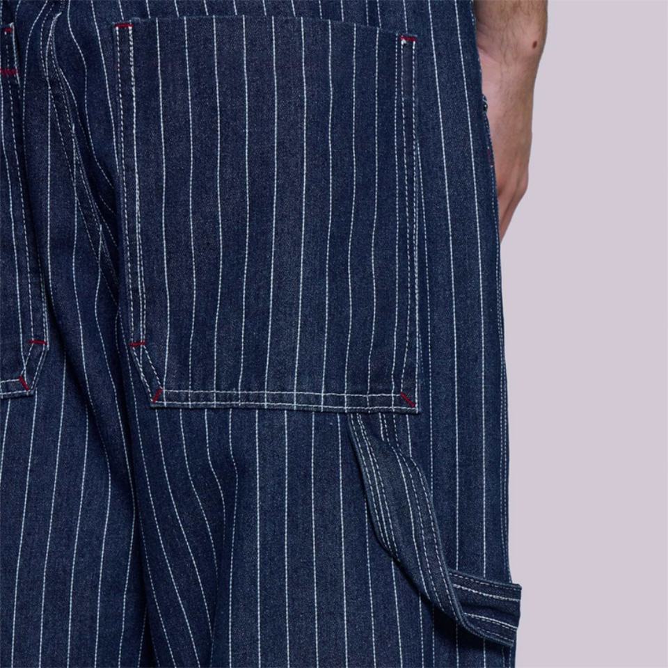 กางเกงยีนส์ผู้ชายทรงวินเทจสไตล์ไฮสตรีท ลายทางสีน้ำเงินขาว ขากว้างทรงโอเวอร์ไซส์ ผ้าเดนิมเนื้อหนา
