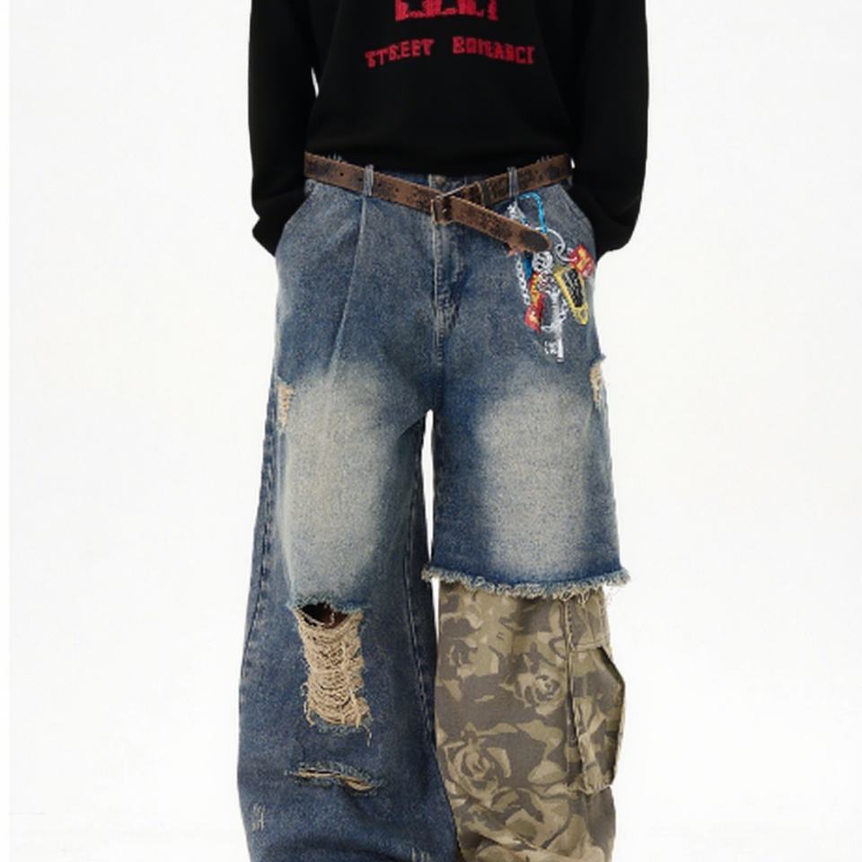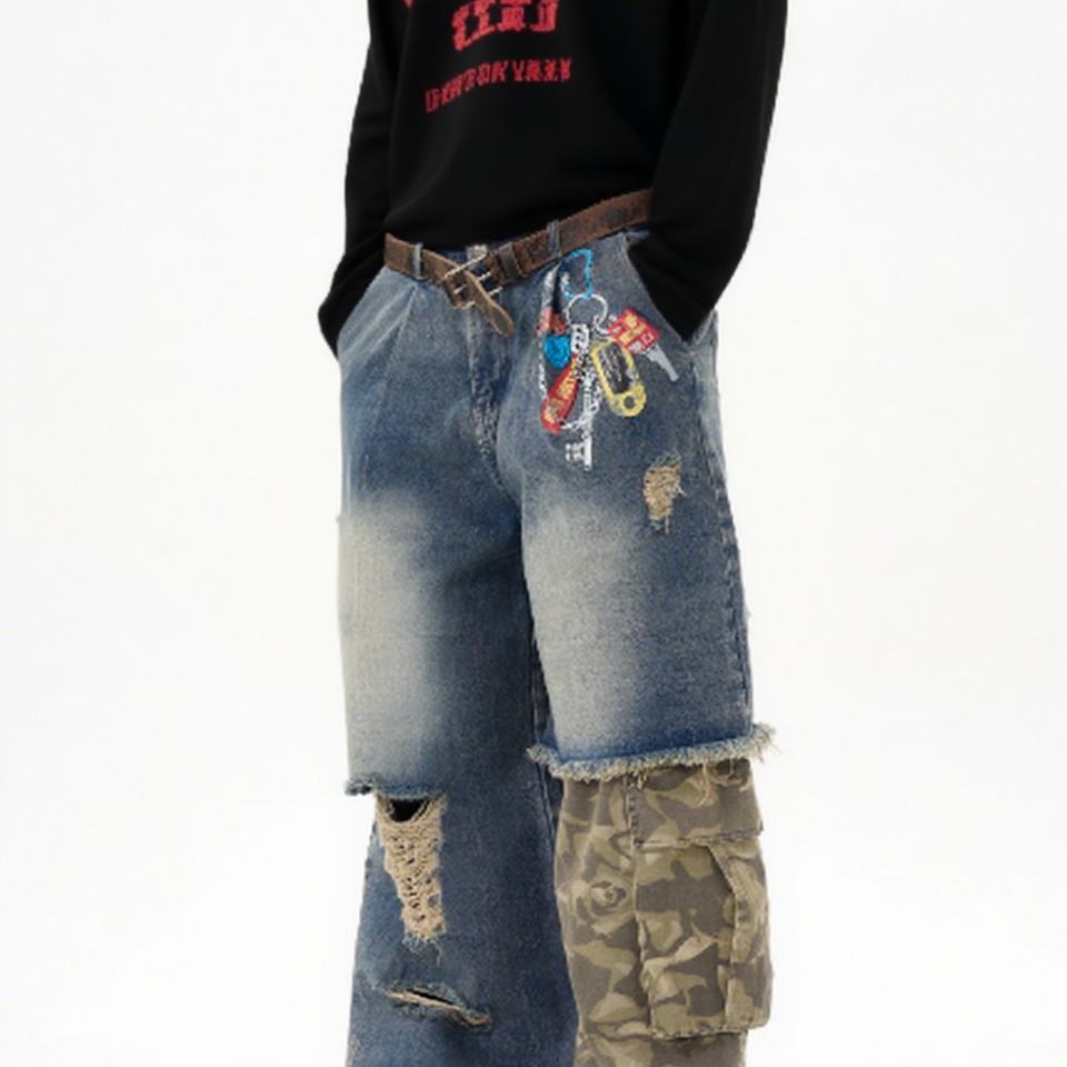 กางเกงยีนส์เดนิมทรงตรงแบบไฮบริดสไตล์คาร์โก้โอเวอร์ไซส์ ลายพรางแบบปะติด ลายพิมพ์วินเทจแบบทำเก่า สำหรับผู้ชาย