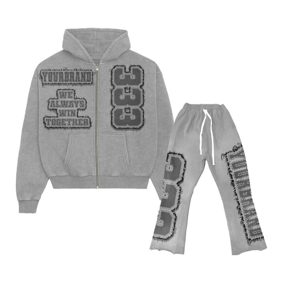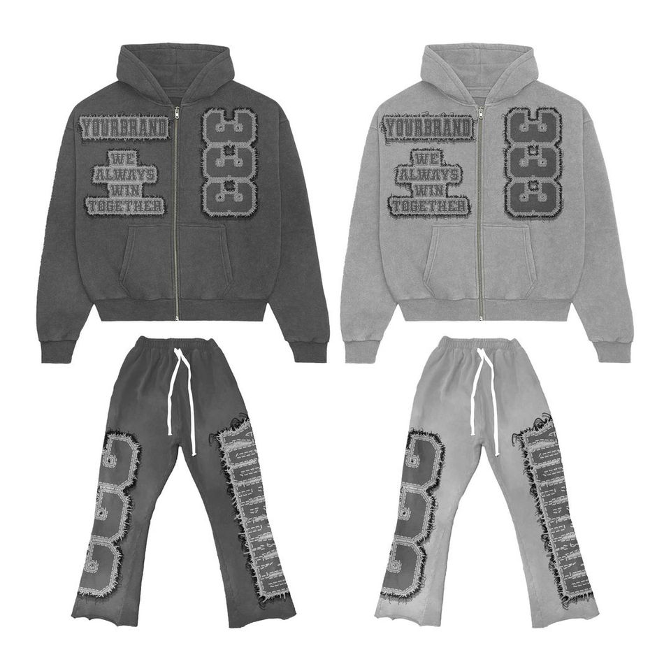 เสื้อมีฮู้ดและกางเกงขาบานแนววินเทจแบบกำหนดเองพร้อมซิปชุดวอร์มปักผ้ากำมะหยี่สำหรับผู้ชาย