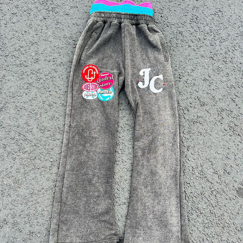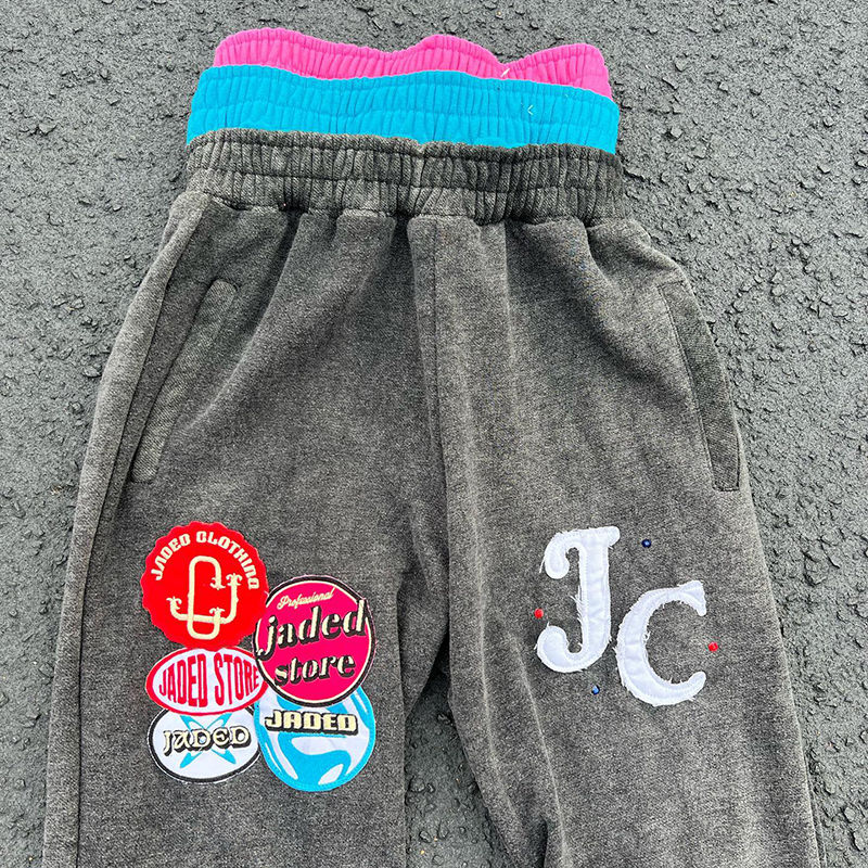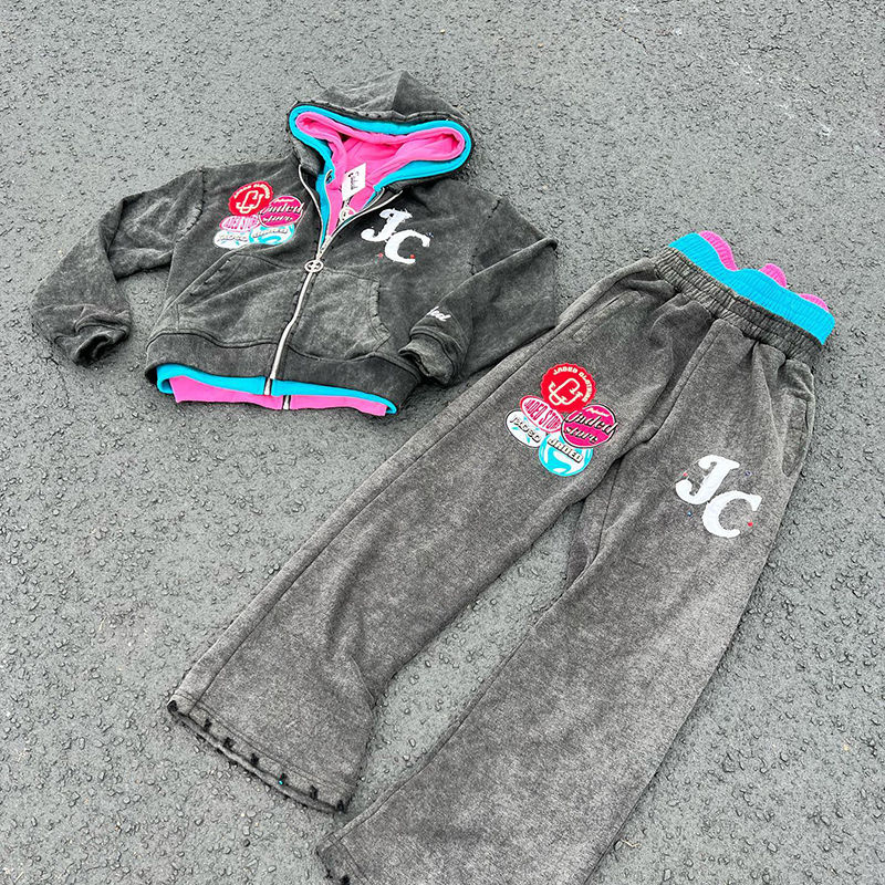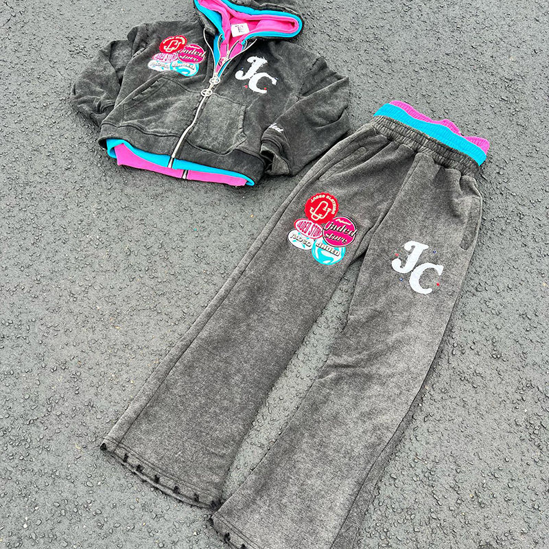 ชุดวอร์มวินเทจแบบกำหนดเอง ชุดเซ็ตเสื้อฮู้ดซิปสามชั้นแบบฟอกสีและกางเกงขายาว ชุดสองชิ้น แต่งลายปะแบบดิสเทรส ชุดวอร์มผู้ชาย
