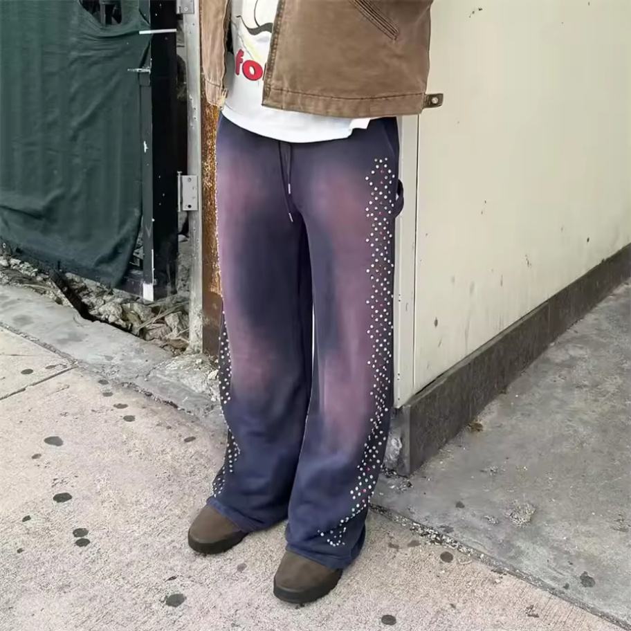ชุดวิ่งเทรนนิ่งสไตล์วินเทจสำหรับผู้ชาย ฮิปฮอป กางเกงทรงหลวมฟอกสีซีดแบบซันเฟด ลวดลายลิง ประดับคริสตัล ยางยืด ผ้าฝ้าย 100% บริการ OEM
