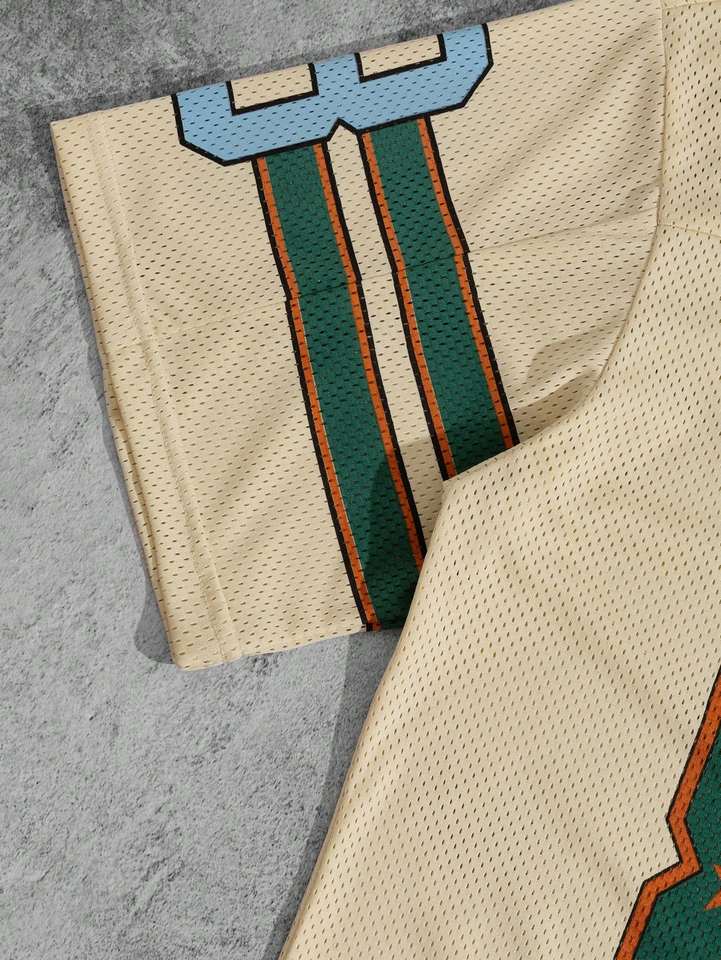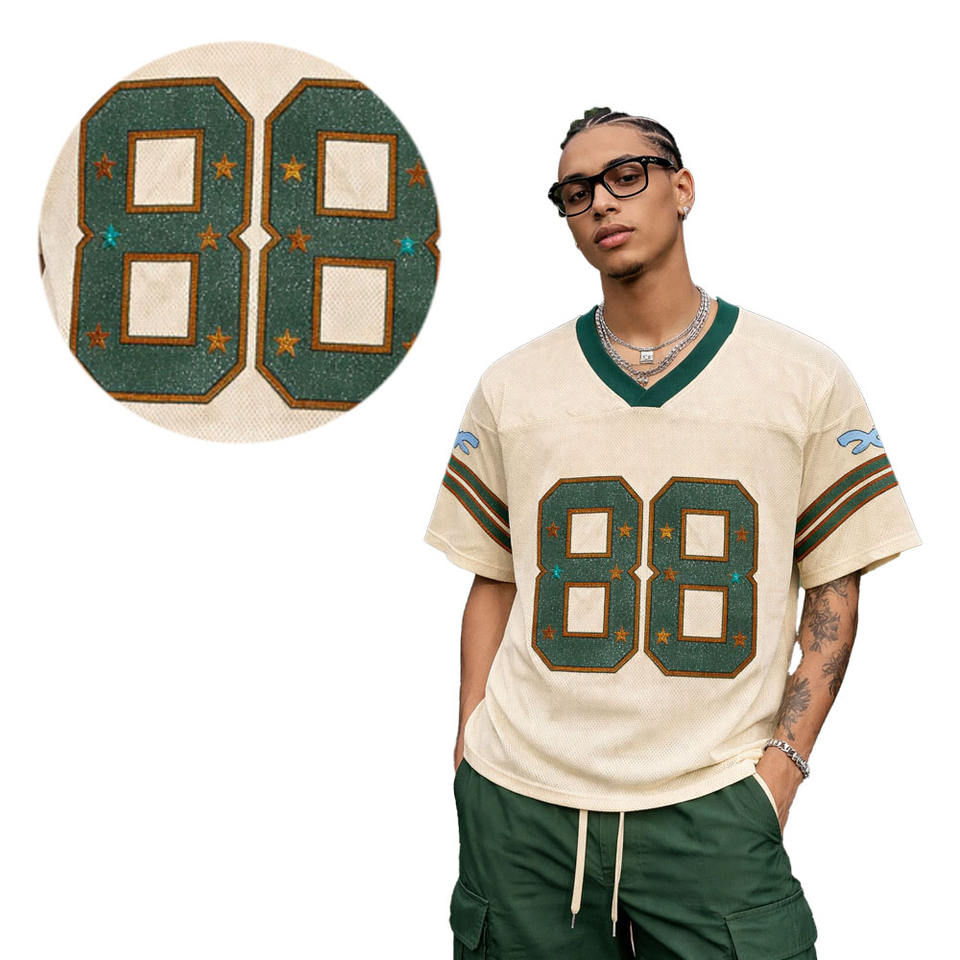 เสื้อฟุตบอลวินเทจแบบตาข่ายสั่งทำพิเศษ ทรงโอเวอร์ไซส์ สตรีทแวร์ ประดับเพชร หมายเลขกราฟิก คอวี สินค้าขายส่งจากอเมริกา เสื้อฟุตบอลอเมริกัน