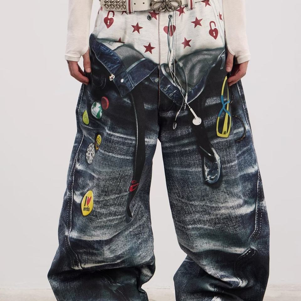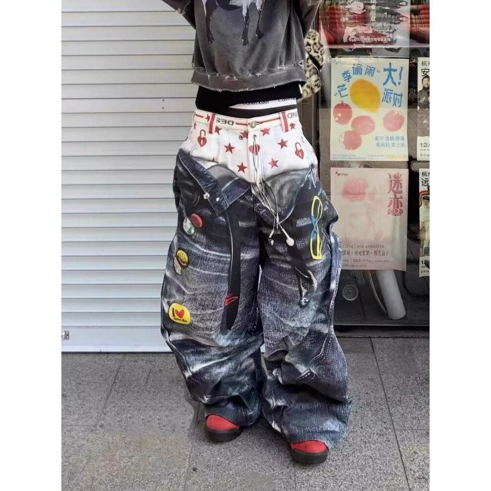 กางเกงยีนส์เดนิมทรงหลวมสไตล์วินเทจเรโทรฮิปฮอปพิมพ์ลายกราฟิกเอวสองชั้นสำหรับผู้ชายและผู้หญิง
