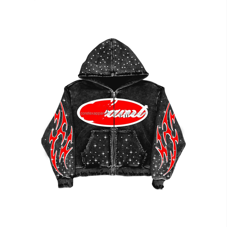 ชุดแทรคสูทสไตล์วินเทจสตรีทแวร์ ลุคซีดจางแบบทำเก่า แต่งลายปักและคริสตัล ทรงหลวม ซิปหน้า สำหรับผู้ชาย