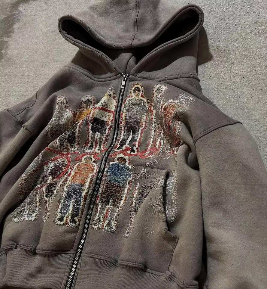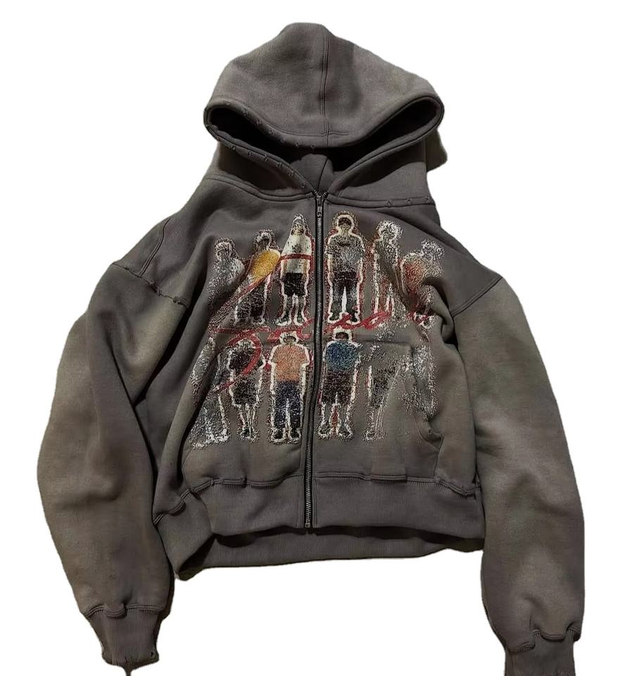แจ็กเก็ตสไตล์วินเทจแบบรูดซิปมีฮู้ดน้ำหนักหนักแบบรูดซิปพิมพ์ลาย DTG DTF