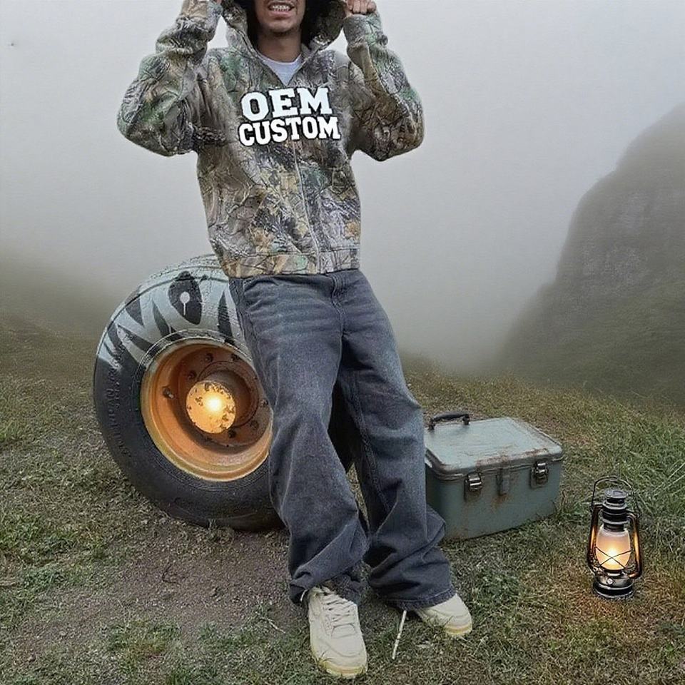 เสื้อฮู้ดดี้ลายพรางต้นไม้สไตล์วินเทจสั่งทำพิเศษ พร้อมงานปักลายพราง เสื้อแจ็คเก็ตซิปแบบมีฮู้ดลายพรางสำหรับผู้ชาย เหมาะสำหรับการล่าสัตว์