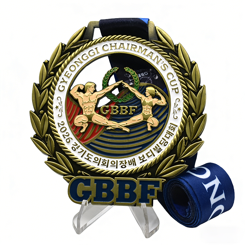 เหรียญรางวัลเพาะกาย GBBF แบบวินเทจสั่งทำพิเศษ ผลิตจากโลหะผสมสังกะสี พิมพ์ลาย UV แบบนูน 3 มิติ พร้อมพวงหรีดรางวัลถ้วยประธานจีองกี สำหรับการแข่งขัน