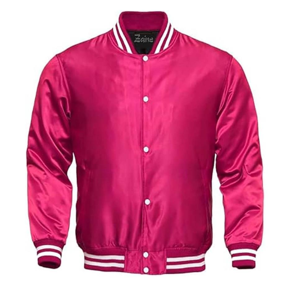 แจ็กเก็ตผ้าซาตินสีชมพูสำหรับผู้ชายเสื้อแจ็กเก็ตผ้าซาตินมีกระเป๋าด้านหน้ามีซิปด้านหน้า