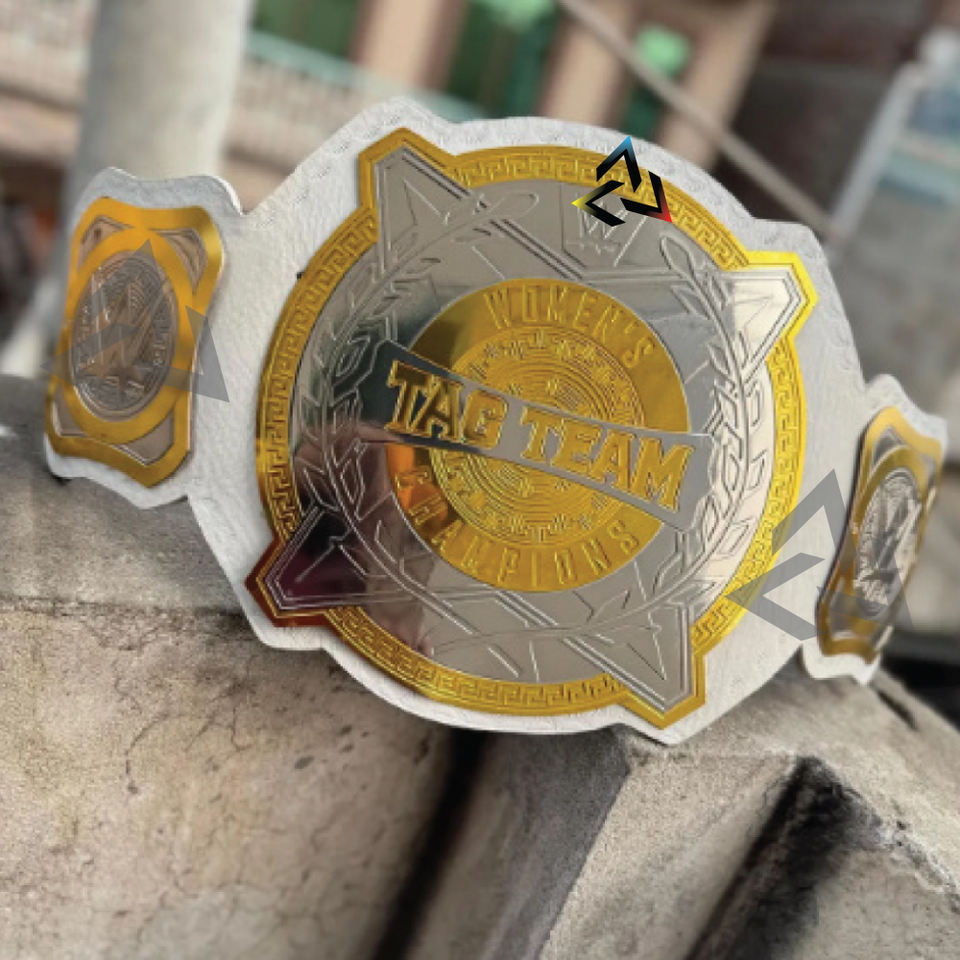 เข็มขัดแชมป์แท็กทีมหญิงแบบกำหนดเอง W-W-E ขนาด 2 มม. ทำจากทองเหลือง น้ำหนักเบา ชุบทองนุ่ม แผ่นโลหะเคลือบทอง สายหนังคุณภาพสูง