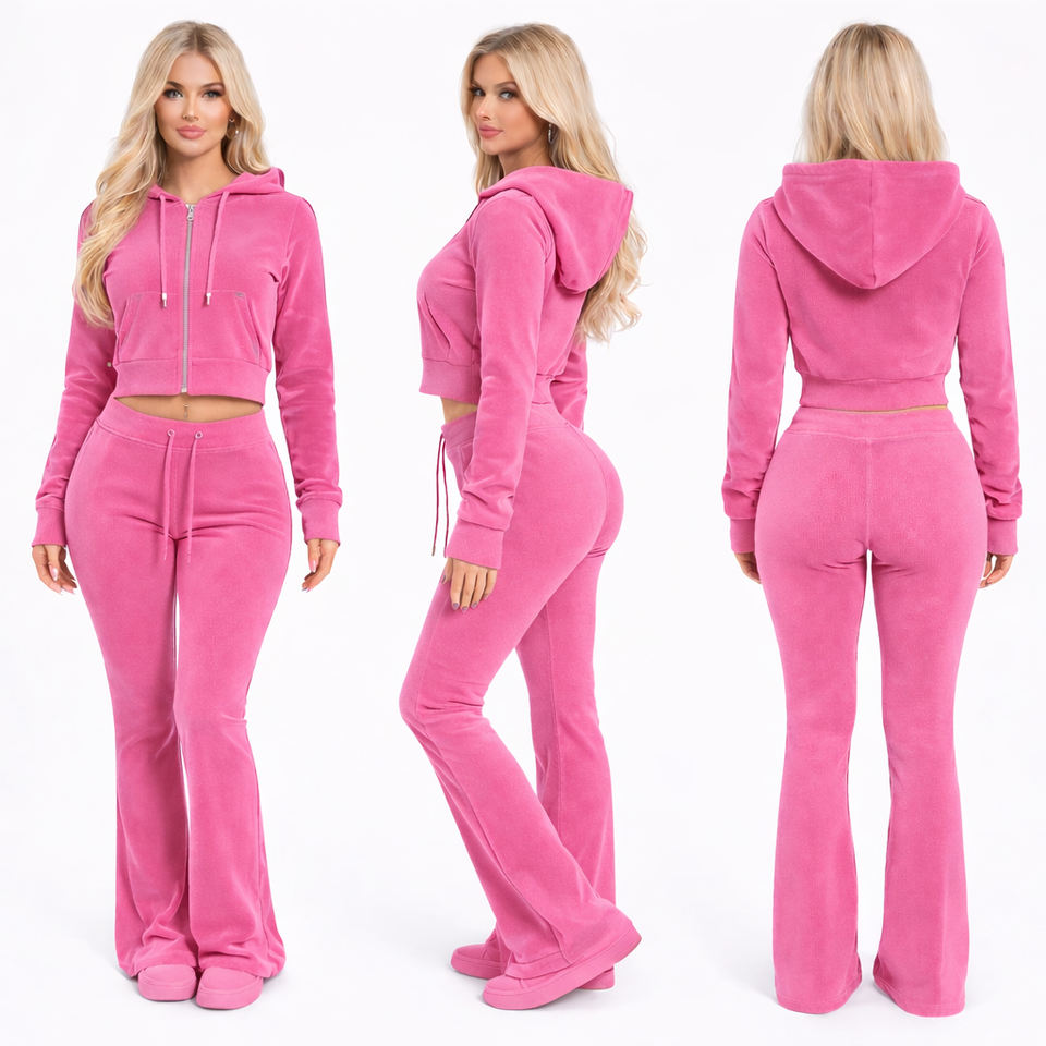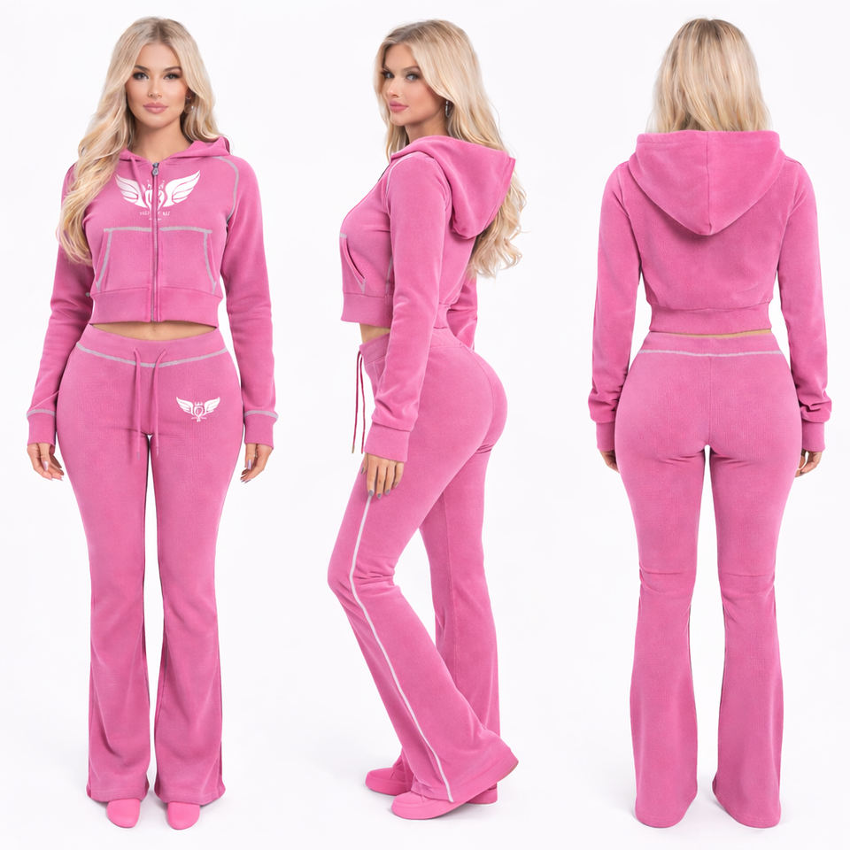 ชุดเซ็ตผ้าวาฟเฟิลถักแบบสั่งทำสำหรับผู้หญิง เสื้อฮู้ดครอปซิปหน้าและกางเกงขาบาน ชุดลำลองหรูหราและสตรีทแวร์แบบสองชิ้น