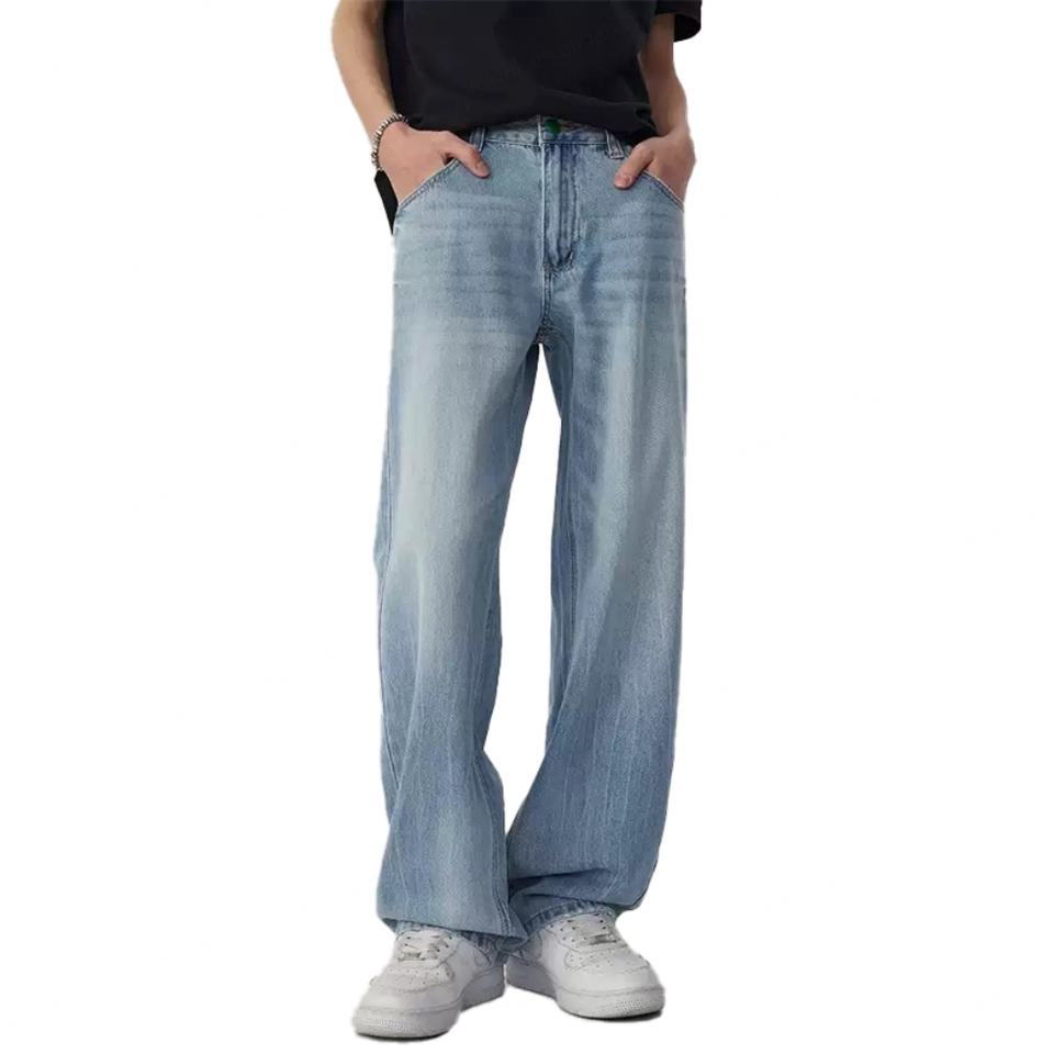 กางเกงยีนส์ฟอกสีคุณภาพสูง ผ้าฝ้ายสำหรับผู้ชาย แฟชั่นลำลอง ทรงตรง ใส่สบาย สีฟ้าอ่อน กางเกงเดนิมผู้ชาย