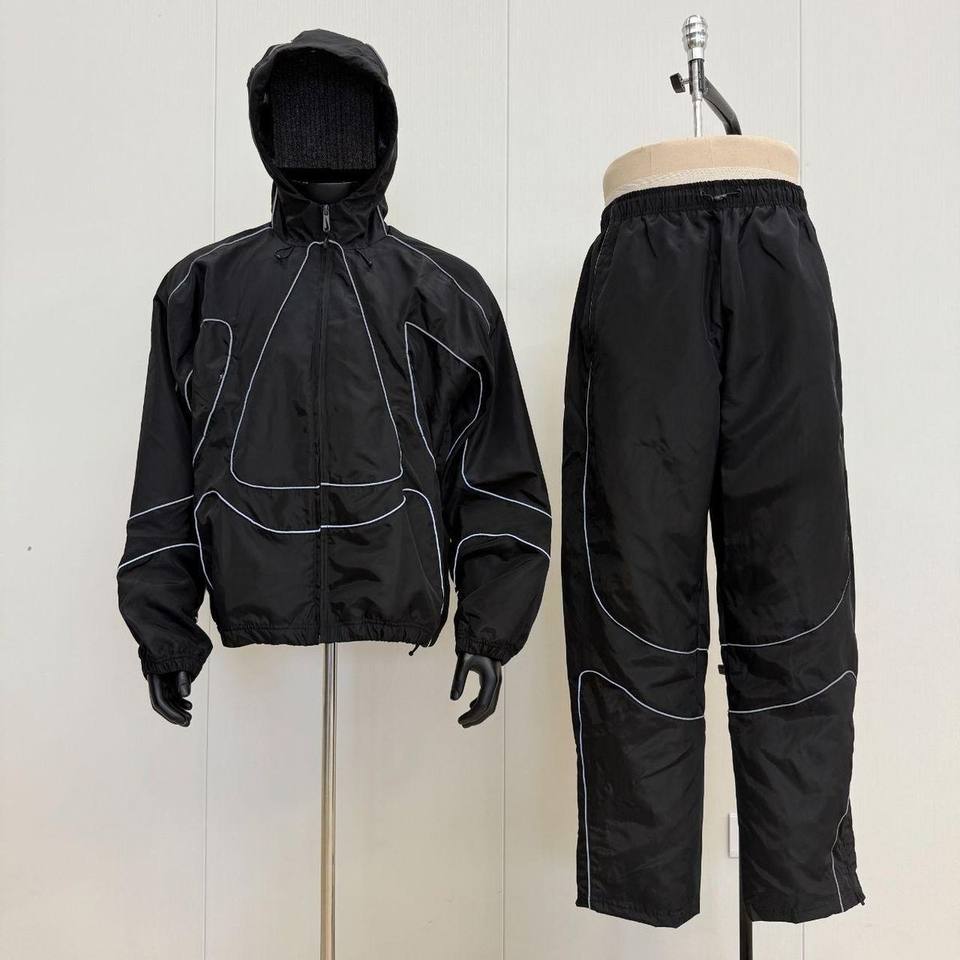 ชุดวอร์มกันน้ำแบบกำหนดเองสำหรับผู้ชาย แจ็คเก็ตและกางเกงผ้าโพลีเอสเตอร์ไนลอนสะท้อนแสง ชุดกีฬากลางแจ้ง