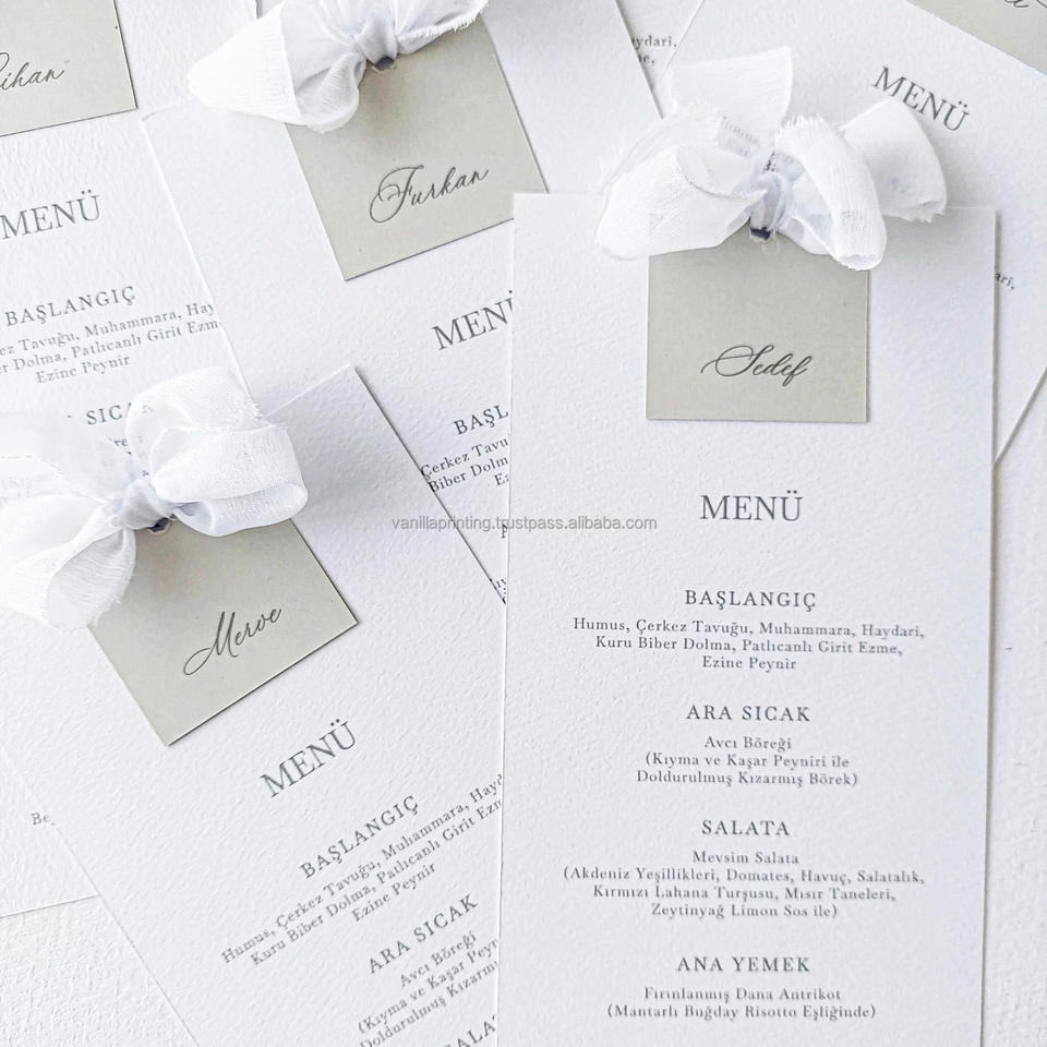 การ์ดเมนูงานแต่งงานที่กำหนดเองพร้อมริบบิ้นเมนูอาหารค่ำงานแต่งงานที่หรูหราพร้อมป้ายชื่อ