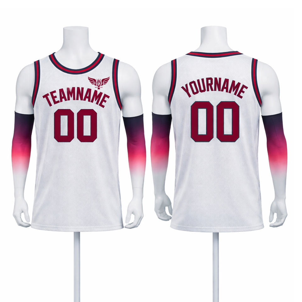 เสื้อบาสเก็ตบอลสีขาวแบบกำหนดเองพร้อมปลอกแขน เสื้อทีมตาข่ายแขนกุดสำหรับผู้ชาย พิมพ์ชื่อและหมายเลขแบบซับลิเมชั่นตามสั่ง