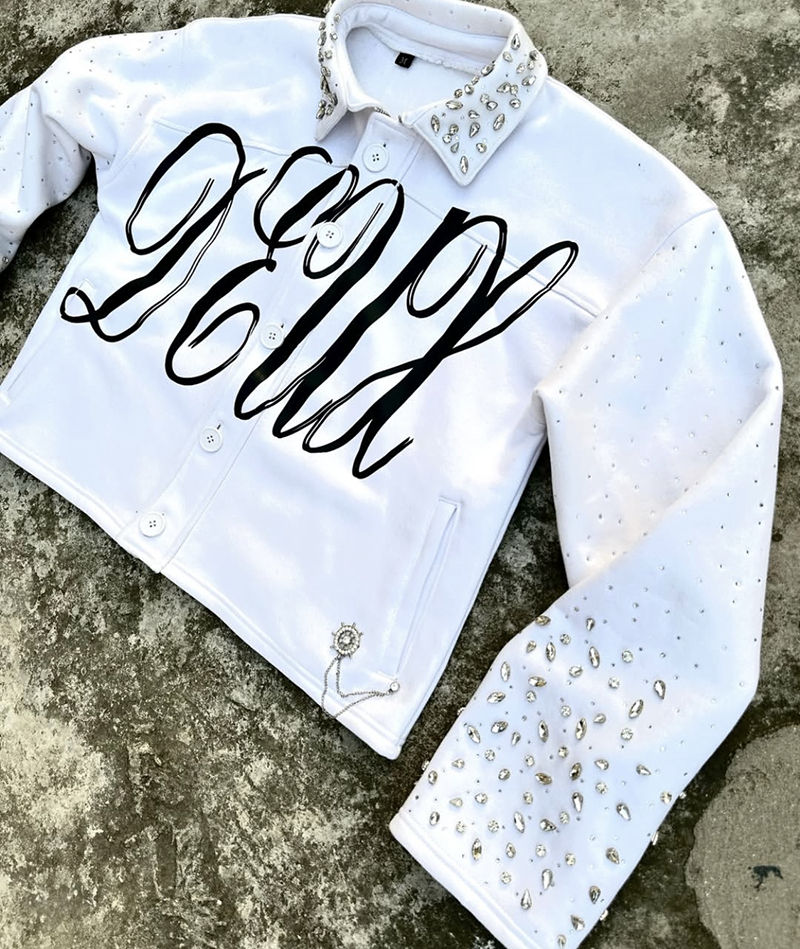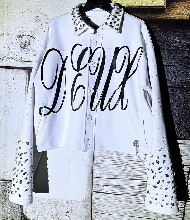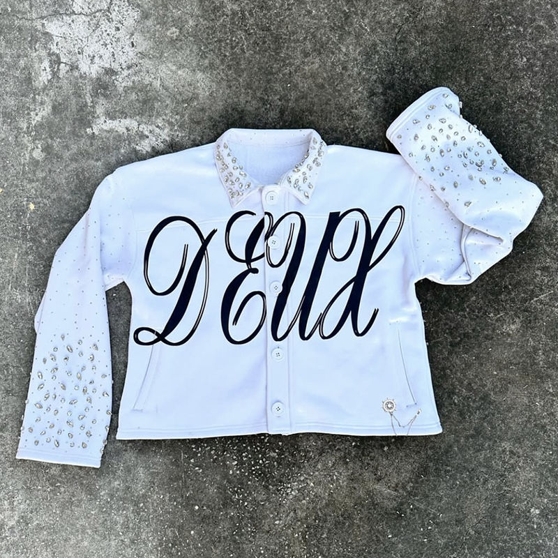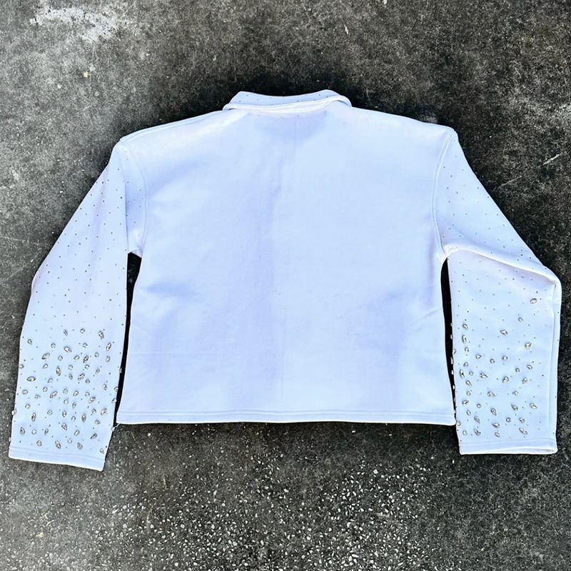 เสื้อเชิ้ตสีขาวมีกระดุมสำหรับผู้ชายสไตล์สตรีทแวร์ทรงบ็อกซี่แขนยาวดีไซน์เนอร์ประดับพลอยเทียม
