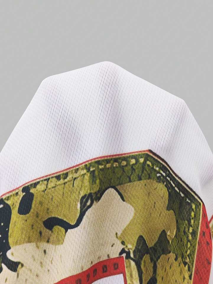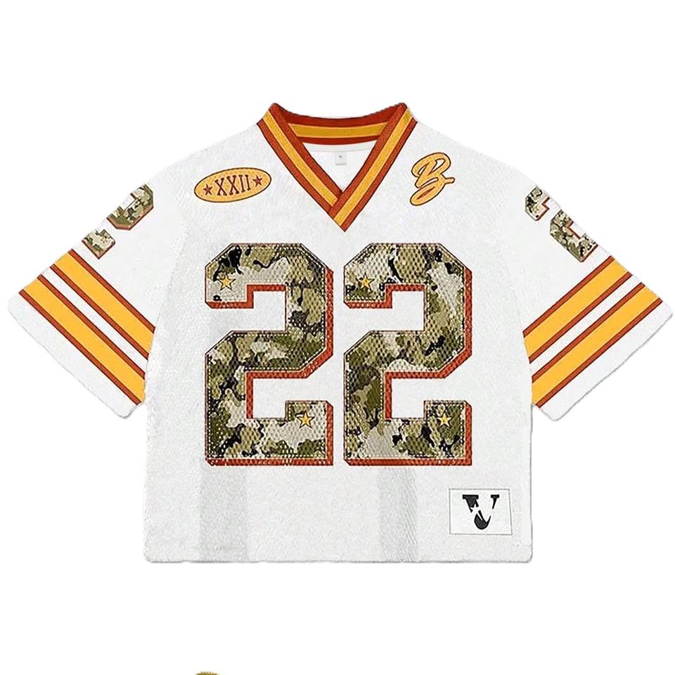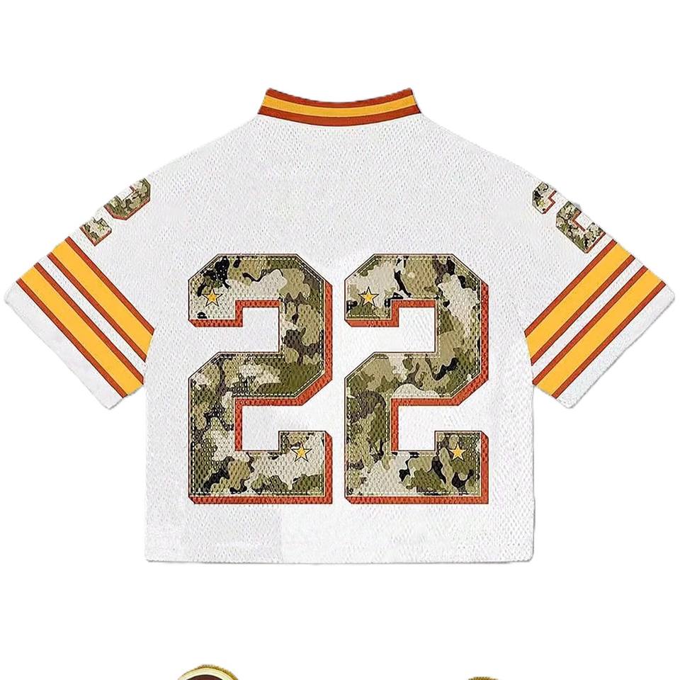 เสื้อฟุตบอลอเมริกันลายพรางสีขาวแบบกำหนดเอง หมายเลข 22 แขนเสื้อลายทาง ผ้าตาข่าย สตรีทแวร์ ผู้ผลิต OEM จำนวนมาก