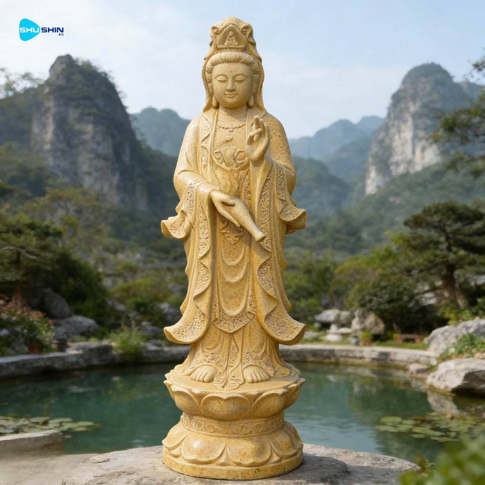 พระพุทธรูปกวนอิมหินอ่อนสีขาวแบบกำหนดเอง ดีไซน์ธรรมชาติ สำหรับใช้งานกลางแจ้ง