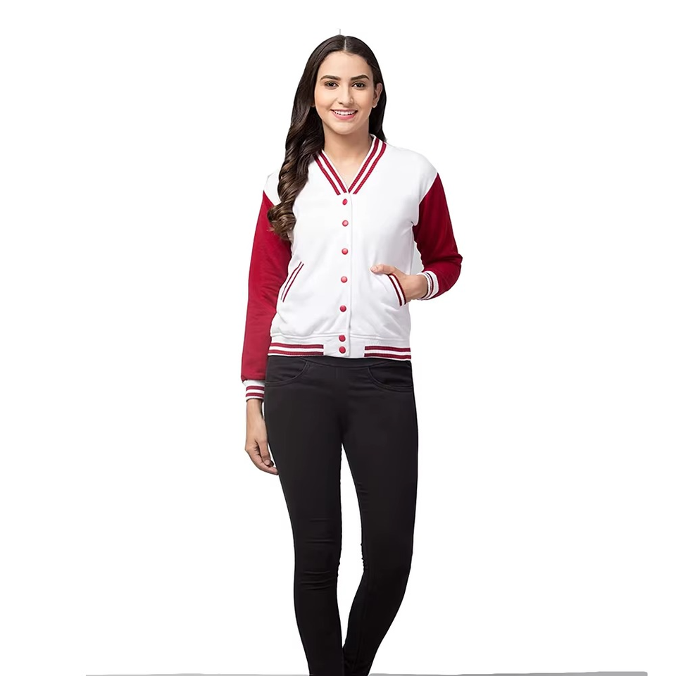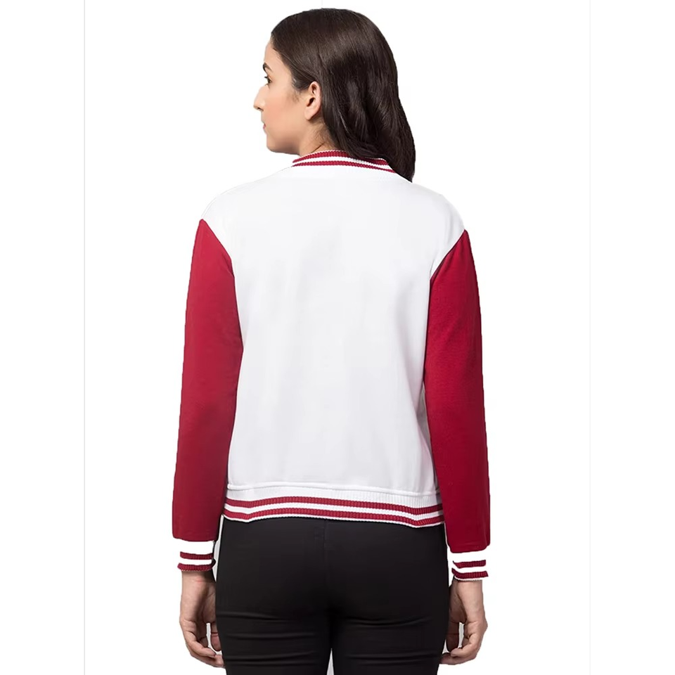 แจ็กเก็ตผู้หญิงสีแดงเลือดหมูเสื้อแจ็กเก็ตเบสบอลบอมเบอร์เครื่องแบบวิทยาลัยแฟชั่นเสื้อแจ๊กเก็ต