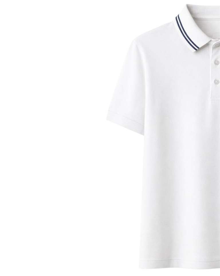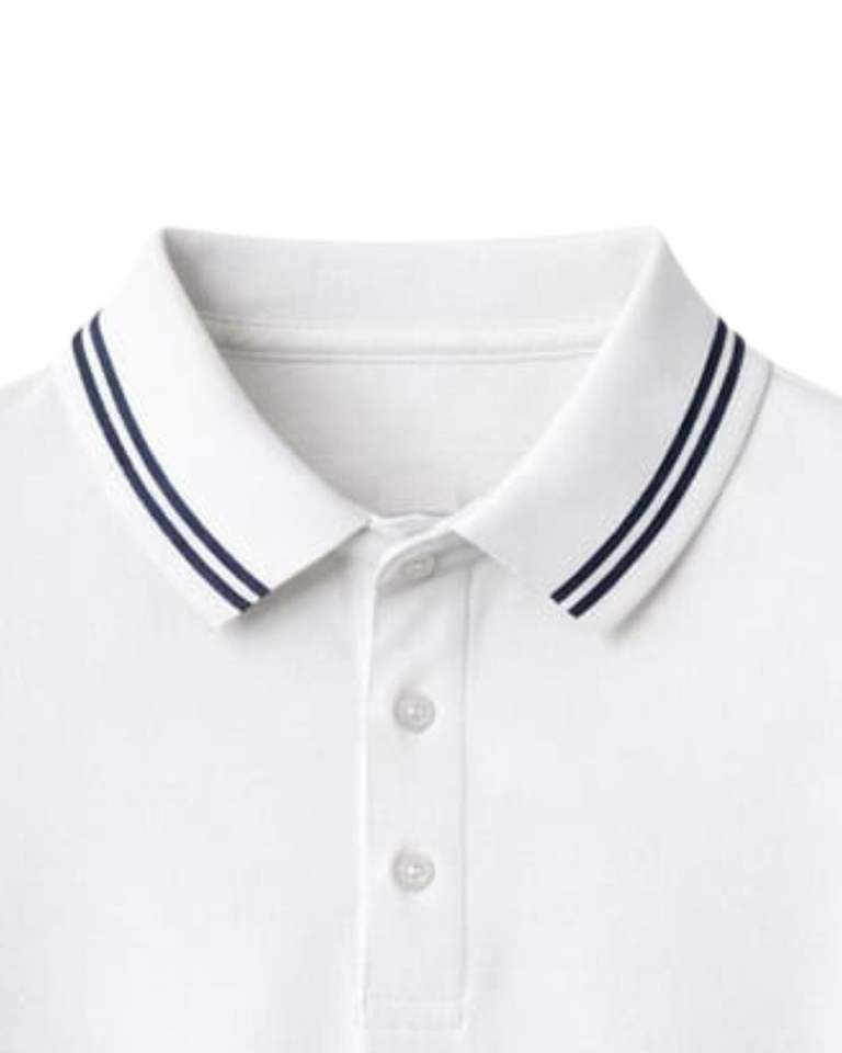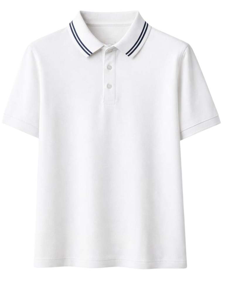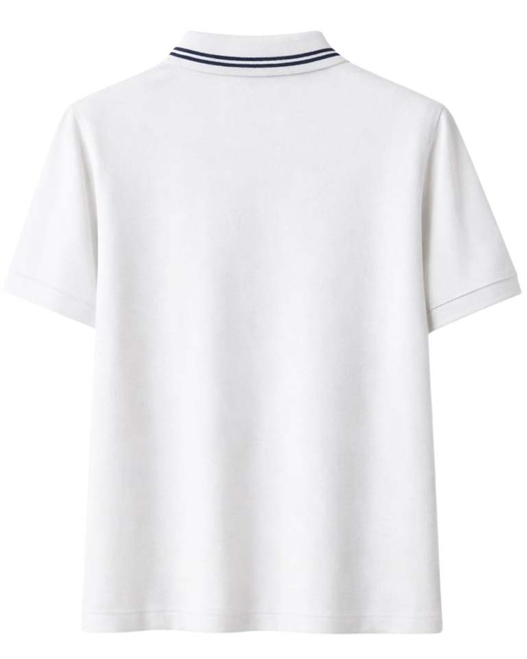เสื้อโปโลผู้ชายสีขาวแบบกำหนดเอง ผ้าคอตตอนผสม แขนสั้น คอปกคลาสสิก เรียบง่าย สไตล์ลำลอง เหมาะสำหรับฤดูร้อน แต่งแถบสีตัดกัน ทรงเข้ารูป