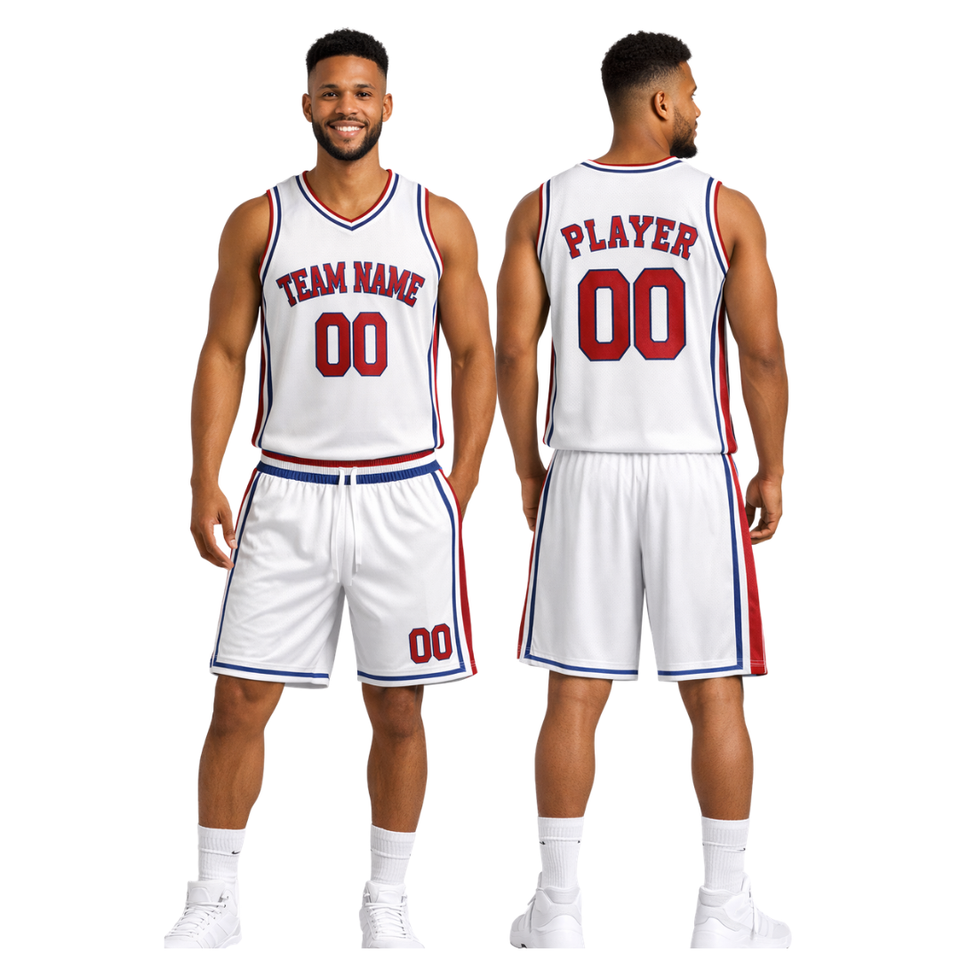 ชุดยูนิฟอร์มบาสเก็ตบอลสีขาวแบบเรียบ รุ่นย้อนยุค พร้อมเสื้อและกางเกงขาสั้นขอบแดงน้ำเงิน ออกแบบชื่อทีมและหมายเลขได้