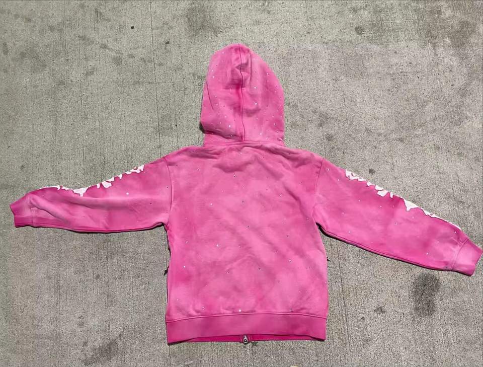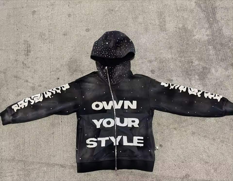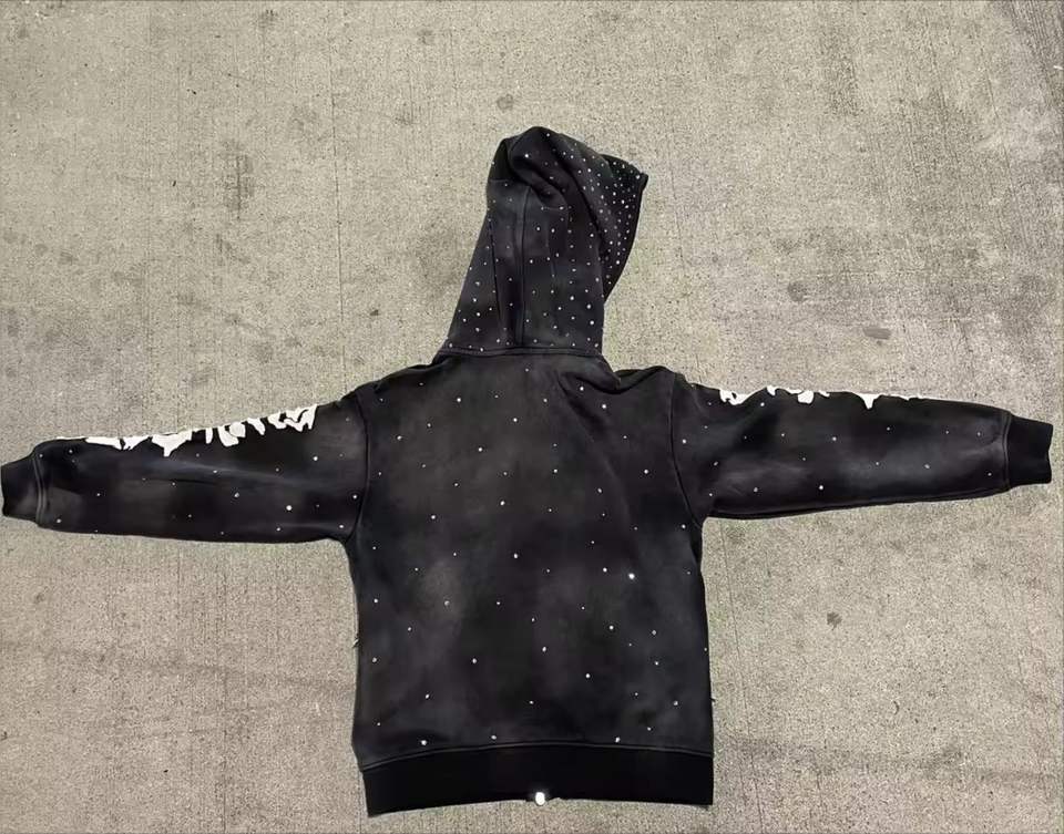 เสื้อฮู้ดแนววินเทจผ้า100% คอตตอนมีซิปรูดขึ้นพิมพ์ลายปักไรน์สโตนกันน้ำมีซับใน