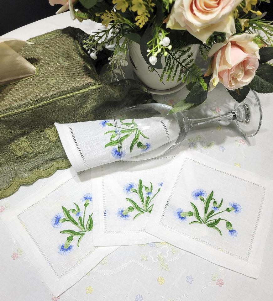 ผ้าเช็ดปากค็อกเทลลายดอกไม้สีฟ้าแบบถัก100% ผ้าลินินสีขาวสำหรับงานกิจกรรมบาร์ที่บ้านโรงแรม