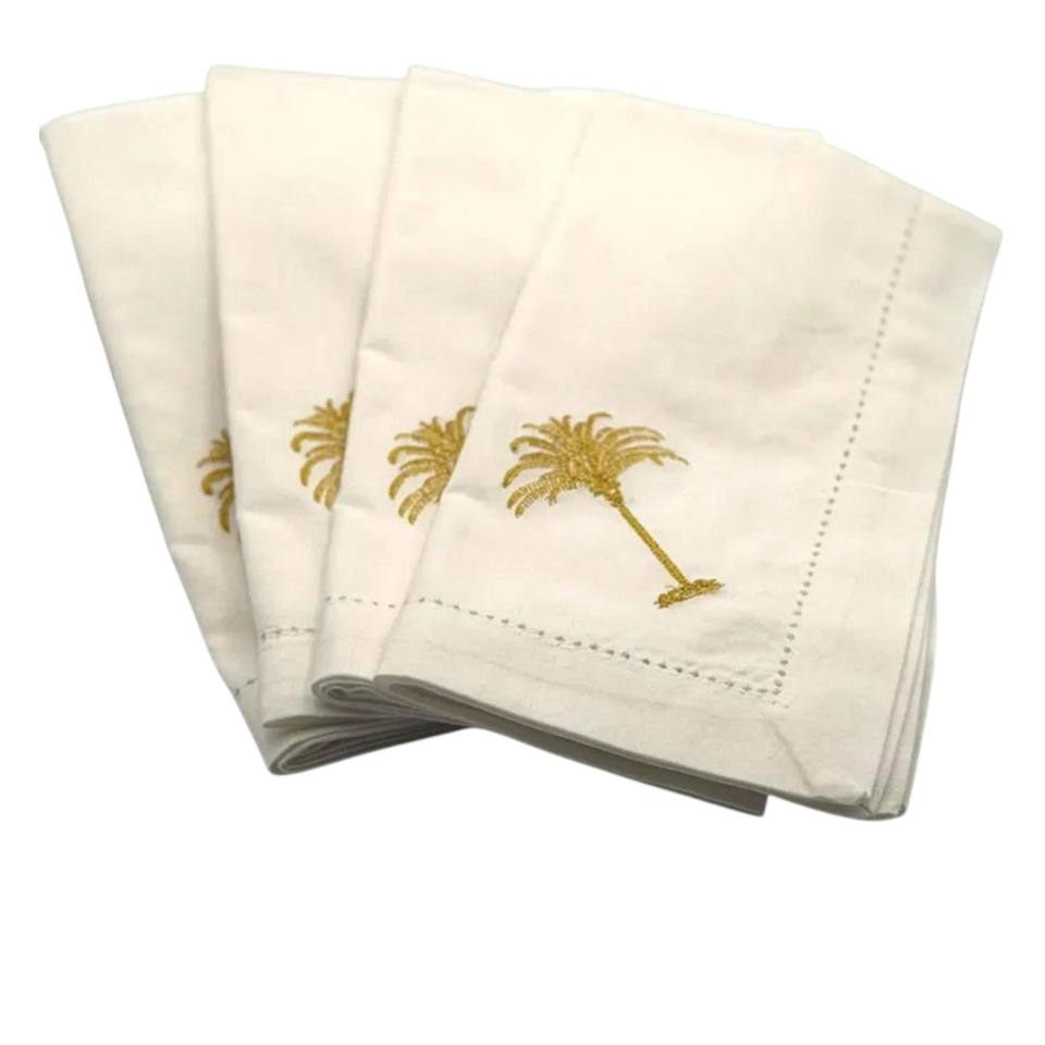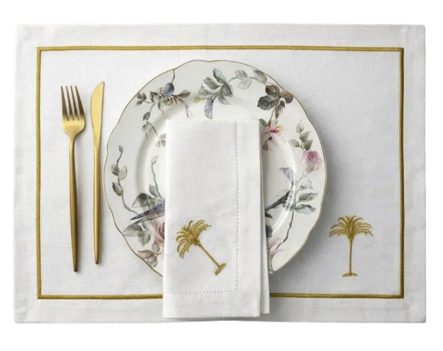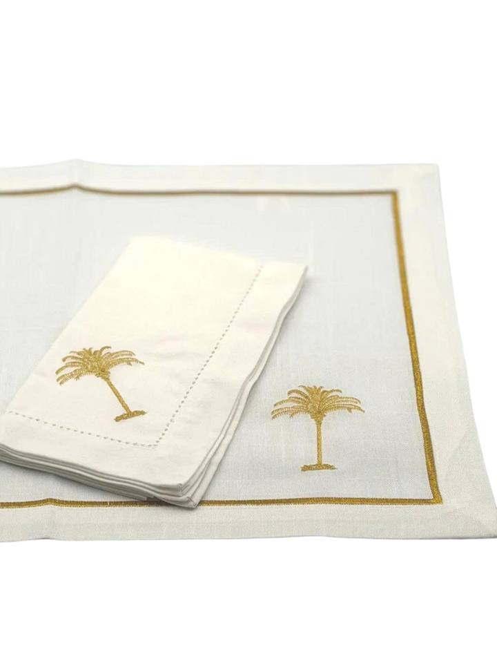 ชุดผ้าปูรองจานและผ้าเช็ดปากปักลายต้นปาล์มสีทอง แบบสั่งทำขายส่ง ซักเครื่องได้ ผลิตจากโพลีเอสเตอร์/ผ้าลินิน เย็บริมแบบเฮมสติทช์ สไตล์โบฮีเมียน สำหรับงานแต่งงาน