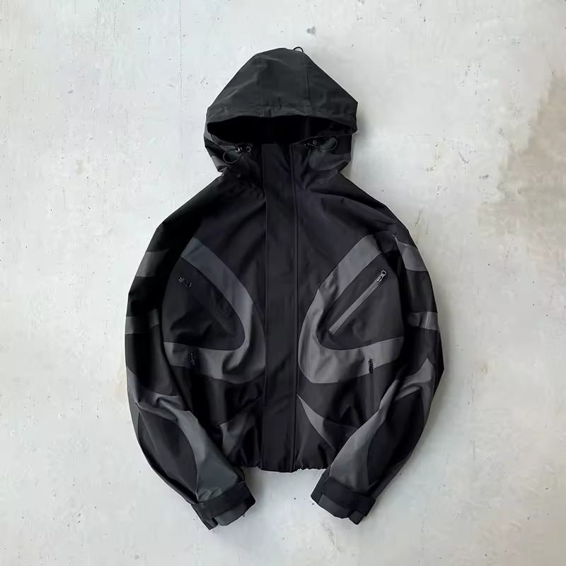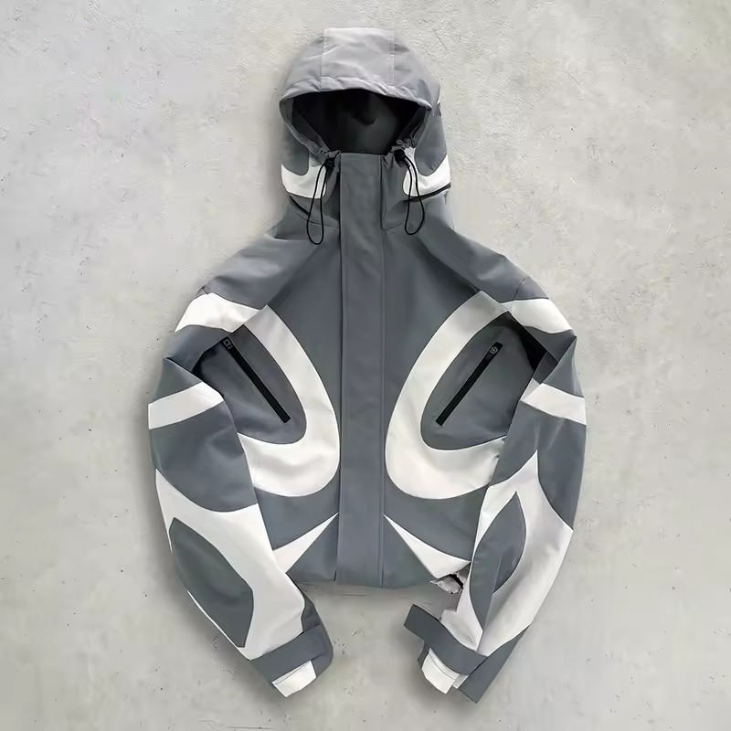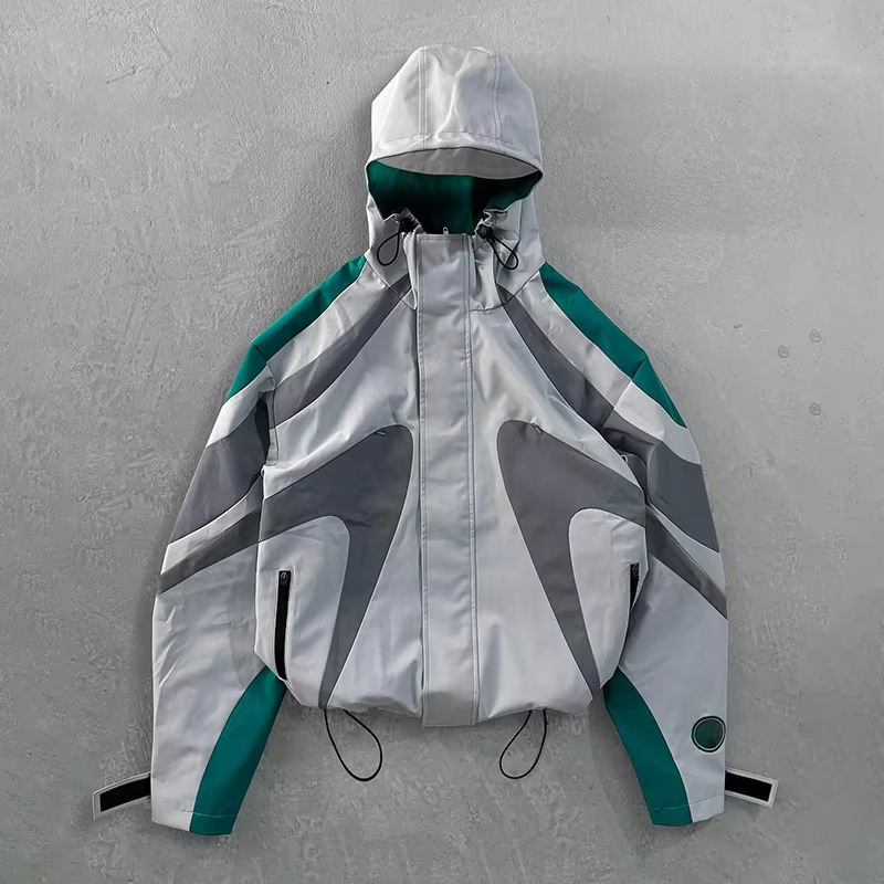 เสื้อแจ็คเก็ตผู้ชายแบบมีฮู้ด สไตล์วินด์เบรกเกอร์ ซิปหน้า ตกแต่งลายปะติดและลายซับลิเมชั่น สำหรับกิจกรรมกลางแจ้ง ลำลอง ใส่ได้ในฤดูใบไม้ร่วง รับผลิตตามสั่งขายส่ง
