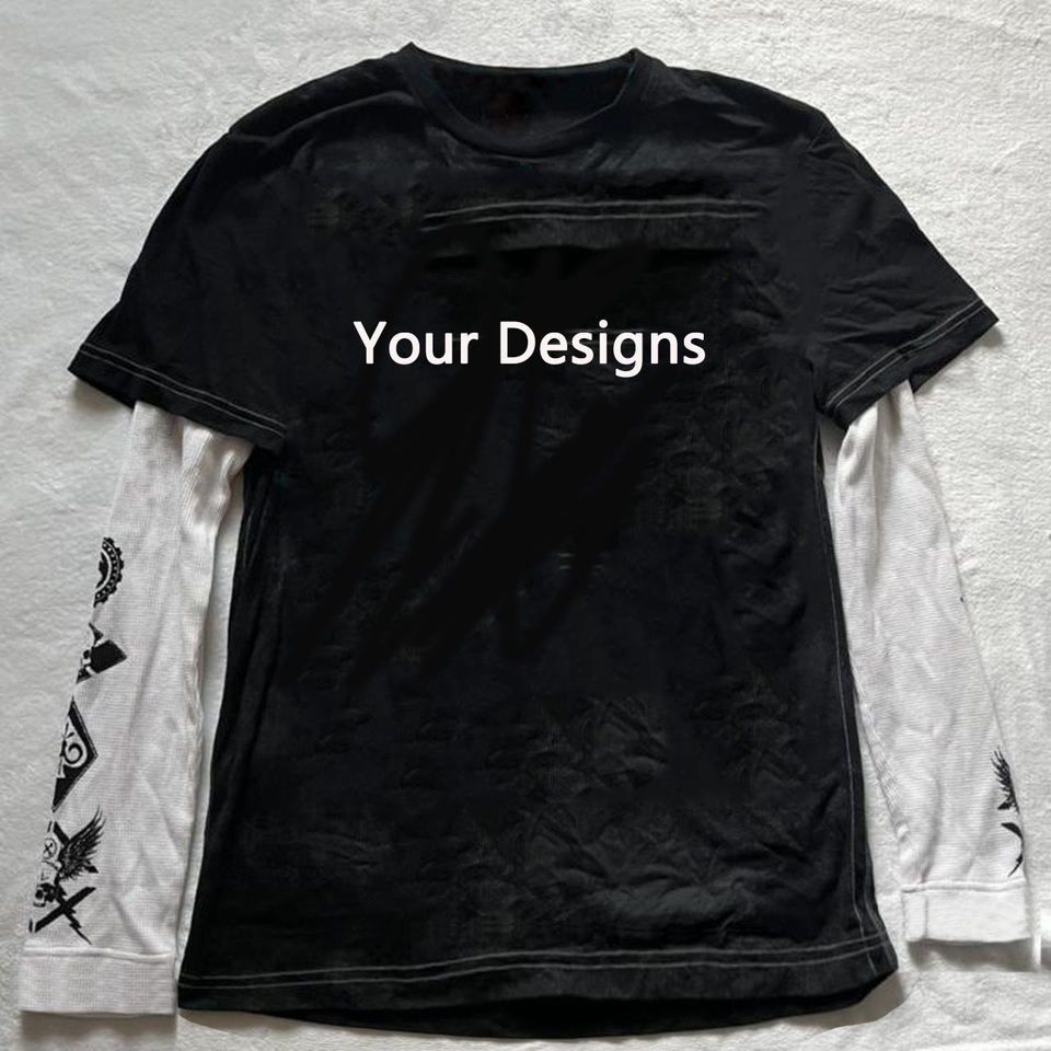 ขายส่งที่กําหนดเองเย็บปะติดปะต่อกันวินเทจกราฟิกยาวตัวอักษรวินเทจพิมพ์ผ้าฝ้ายรู้สึกเสื้อยืดแขนยาวสองชั้น