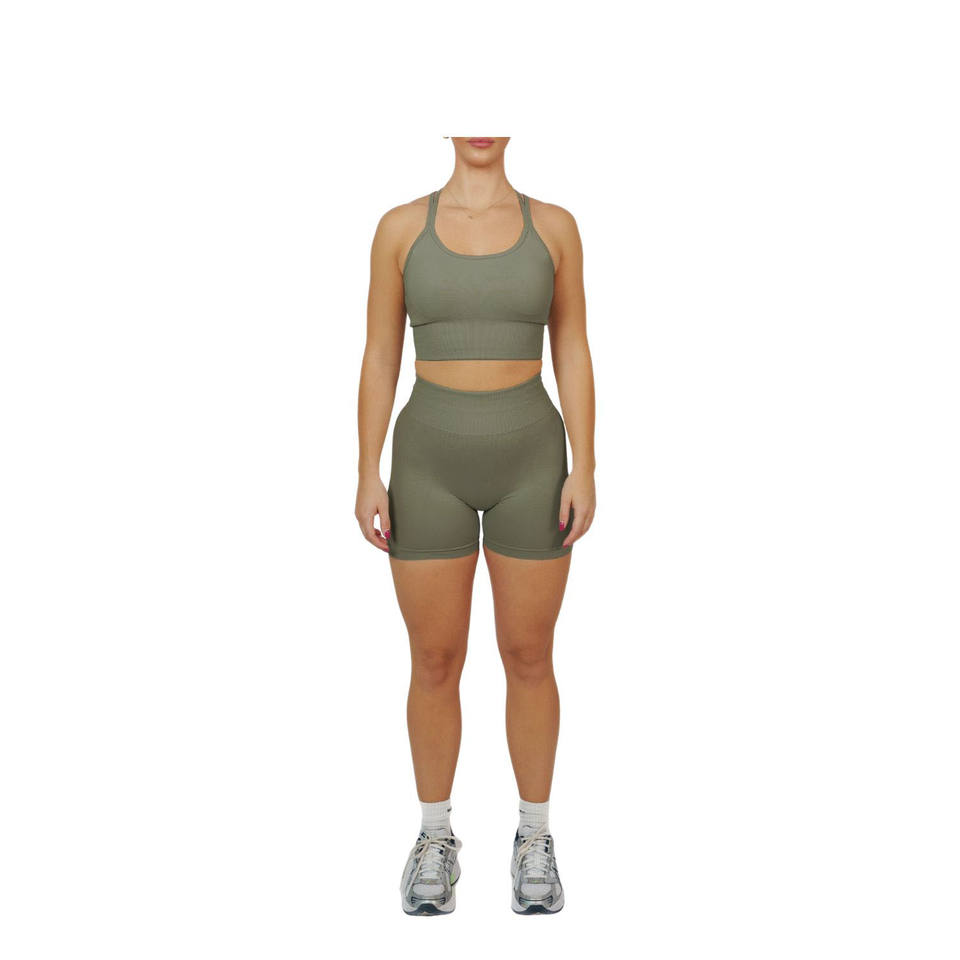 ชุดออกกำลังกายไร้รอยต่อสำหรับผู้หญิงไซส์ใหญ่แบบขายส่ง ชุดโยคะแบบมีสายรัด บราออกกำลังกาย กางเกงขาสั้นเอวสูงแบบรัดรูป 2 ชิ้น ลายสก็อตและสีพื้น สำหรับออกกำลังกายที่ยิม