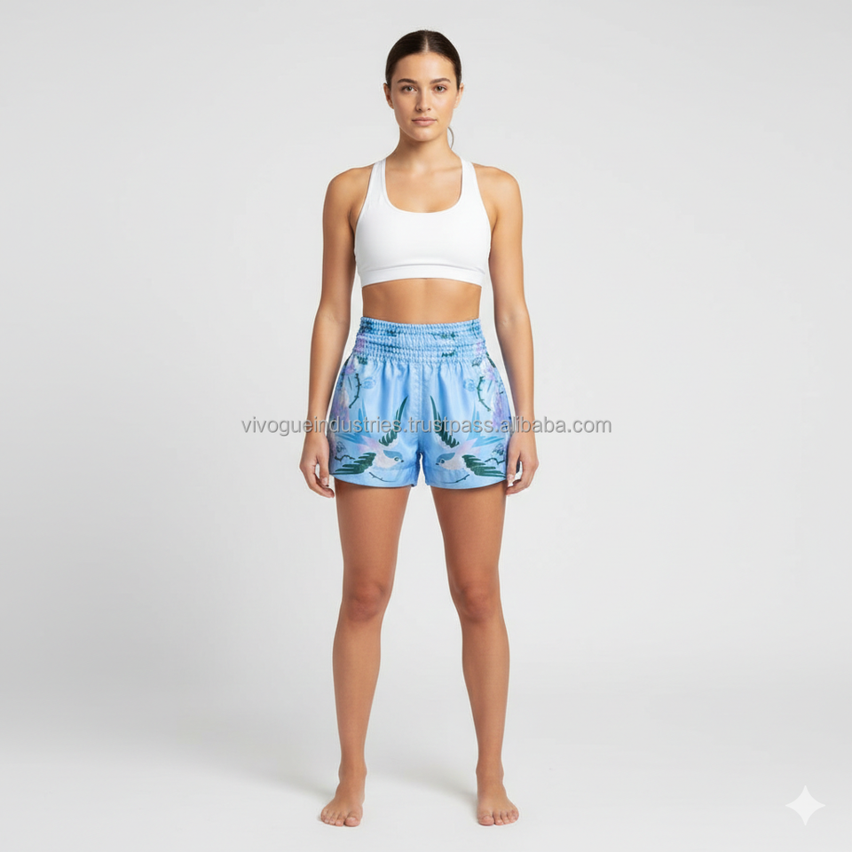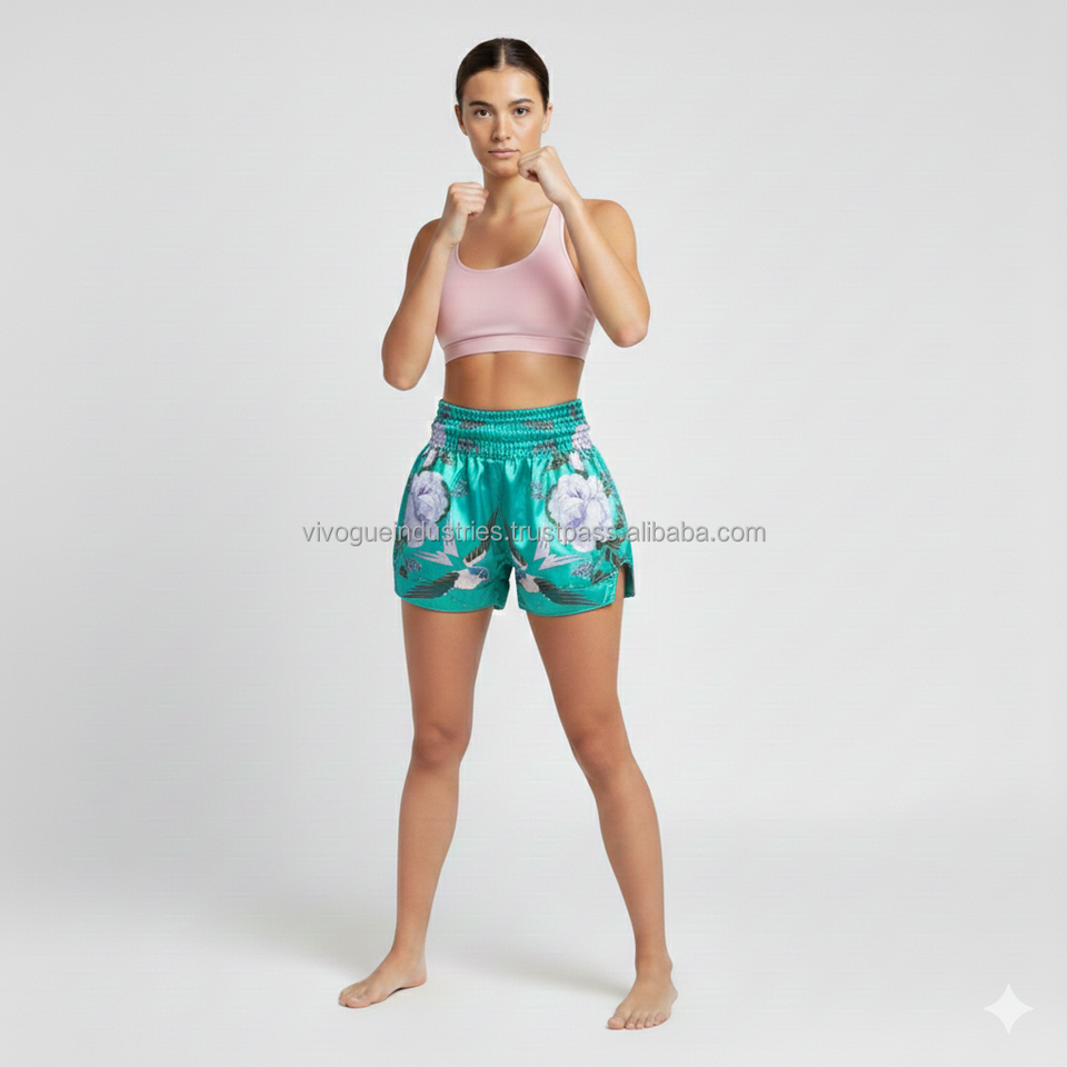 กางเกงมวยไทยผู้หญิงสั่งทำขายส่ง ปักโลโก้ด้านหน้า สไตล์เรโทร กางเกงมวยปล้ำ 100% โพลีเอสเตอร์ ทนทานและระบายอากาศได้ดี ทรงขาสั้น