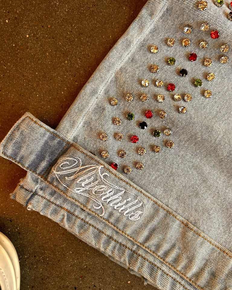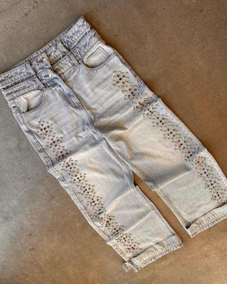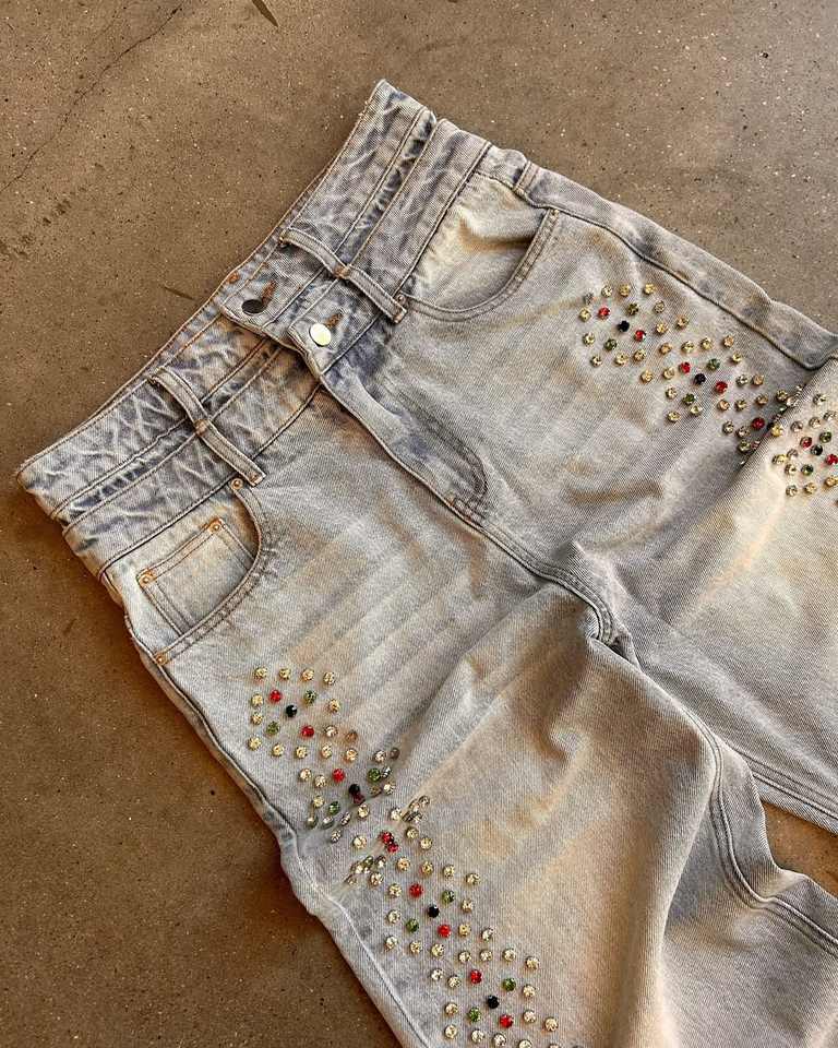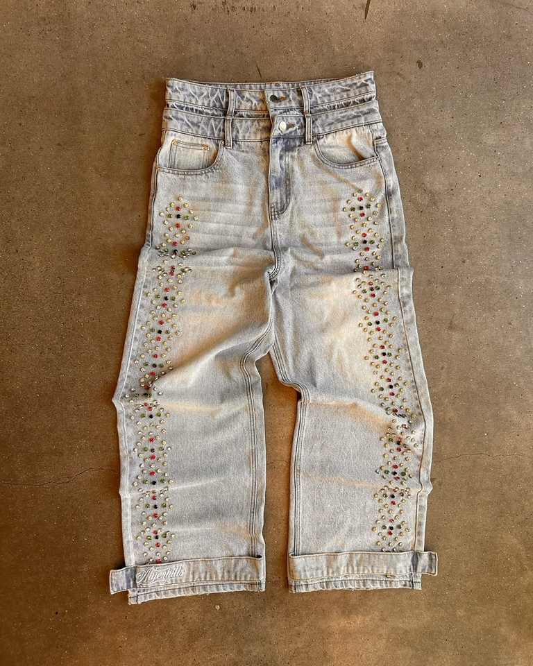 กางเกงยีนส์ทรงบานแบบสั่งทำขายส่ง ผ้าเดนิมสีทรายฟอกแบบสโตนวอช ระบายอากาศได้ดี สไตล์สตรีทแวร์ ปักลายเพชรคริสตัล สำหรับฤดูหนาว รับผลิตแบบ OEM