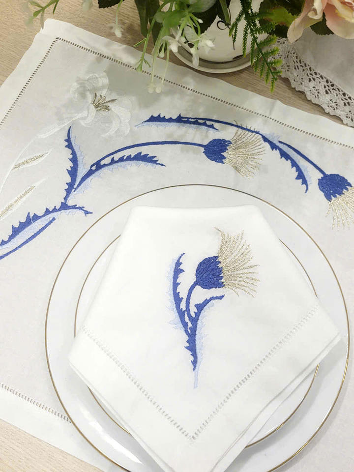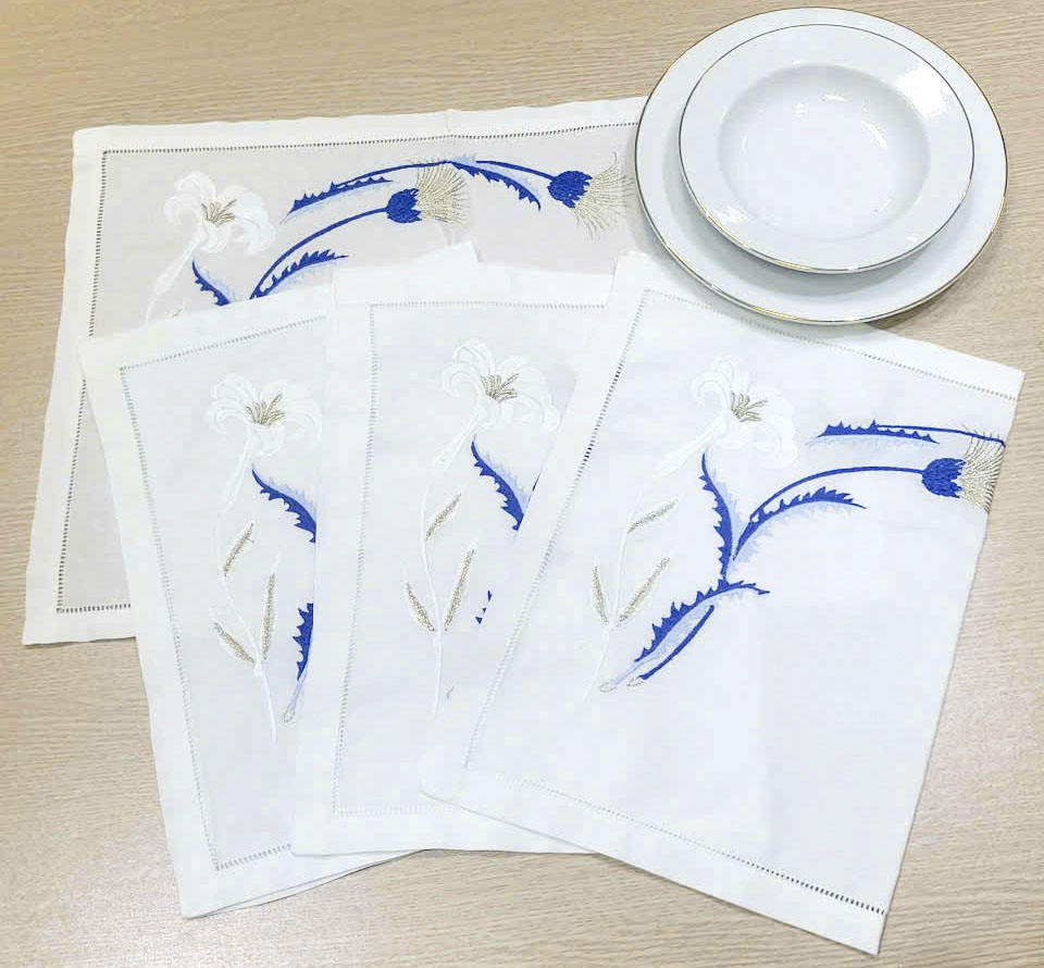 ชุดผ้าปูโต๊ะและผ้าเช็ดปากปักลายดอกไม้สวยงาม แบบสั่งทำขายส่ง ซักได้ ผลิตจากผ้าฝ้ายสีขาว ตกแต่งขอบด้วยเทคนิคเฮมสติทช์ เหมาะสำหรับใช้ในบ้าน งานแต่งงาน และงานอีเว้นท์ต่างๆ
